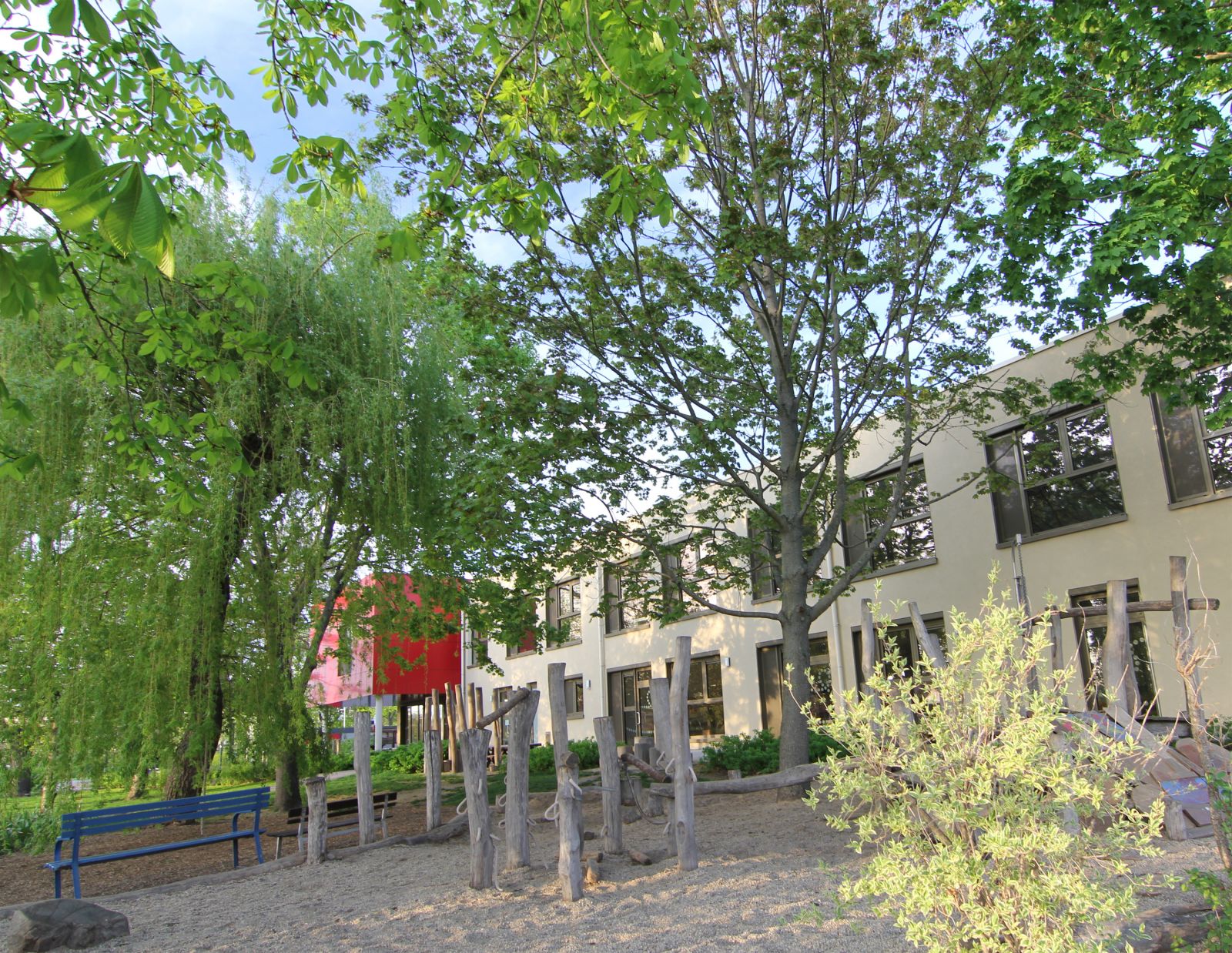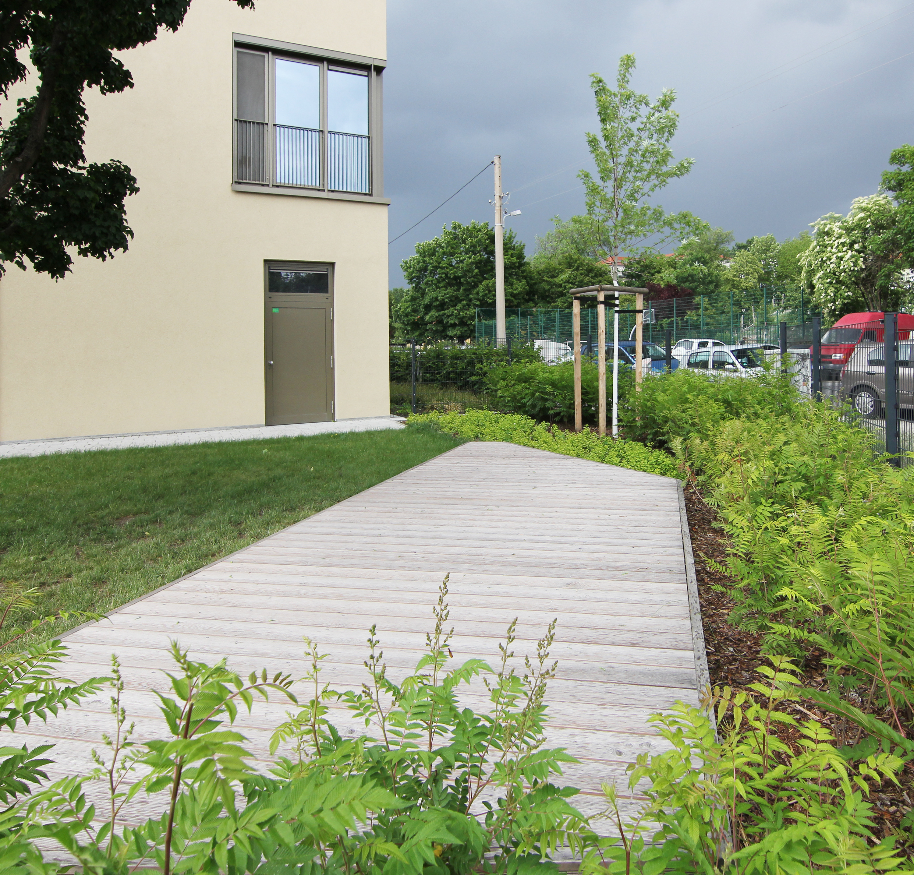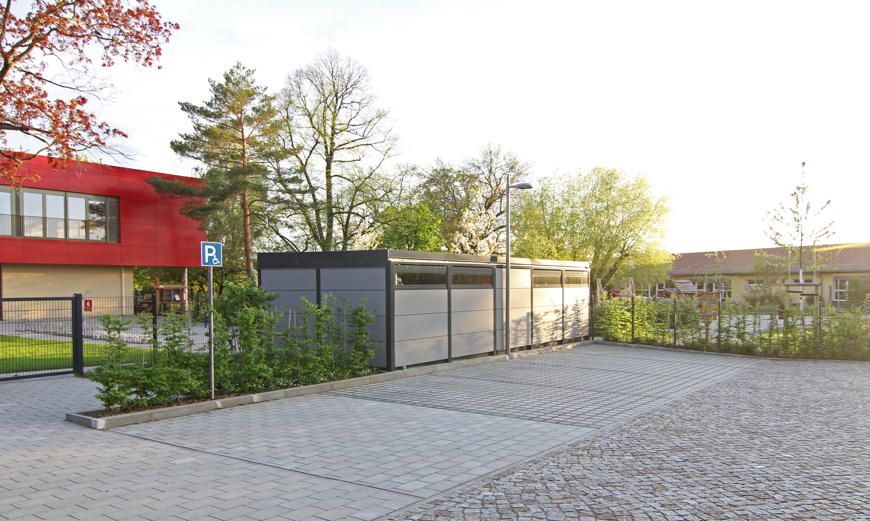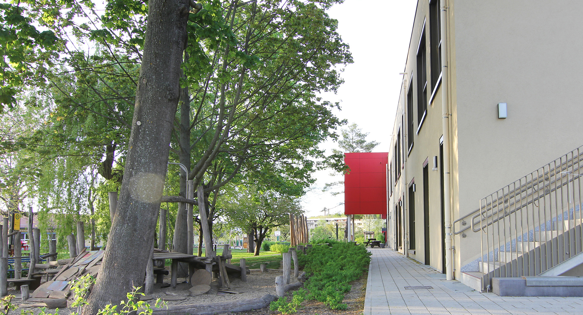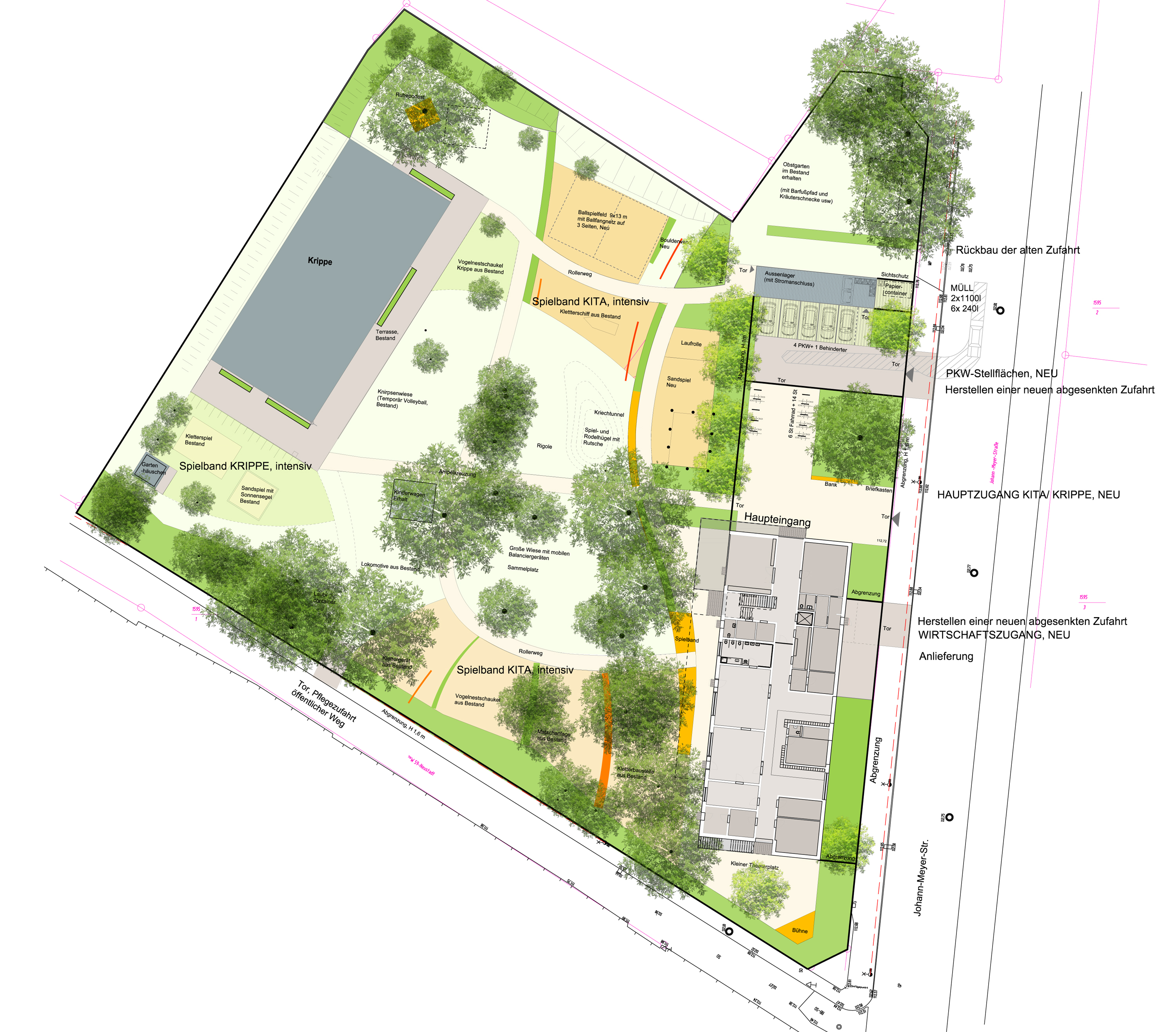 Aufgrund der Änderung der Lage des geplanten Gebäudes gegenüber dem Bestand musste insbesondere der gesamte Erschließungs- und Wirtschaftsbereich sowie der Abbruchbereich des Altgebäudes neu geplant und gestaltet werden. Neben der Neuordnung der Erschließungsflächen ist eine Anpassung und der Entwurf neuer Spielbereiche notwendig. Die Wünsche und Anforderungen des Nutzers werden berücksichtigt und gleichzeitig die Barrierefreiheit der Freiflächen umgesetzt.