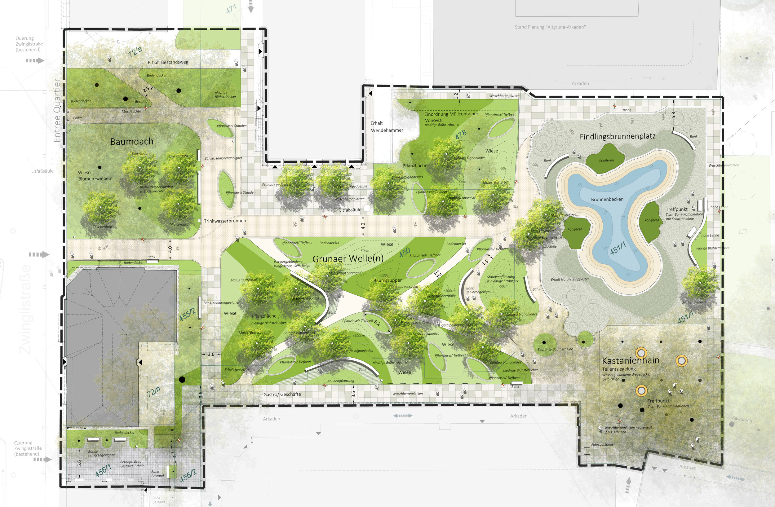 Derzeit planen wir mehrere Teilbereiche im Grünzug Altgruna zwischen der Zwinglistraße und der Rosenbergstraße in Dresden. Neben der Aufwertung der Aufenthaltsqualität durch viele Baumpflanzungen, blühende Strauch- und Staudenflächen, ist eine Vielzahl verschiedener Sitzmöglichkeiten für alle Generationen geplant und auch ein Trinkbrunnen soll aufgestellt werden.