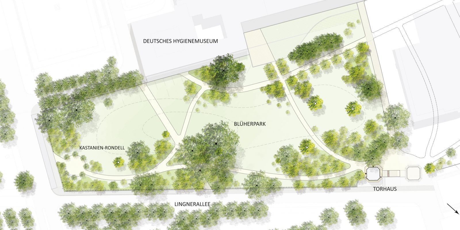 Gegenstand der Planung war die Wiederherstellung des nördlichen Teils des Dresdner Blüherparks. Im Vorfeld wurde dafür bereits durch unser Büro eine Denkmalpflegerische Zielstellung erarbeitet, welche die Grundlage der weiteren Planung bildete. Grundsätzlich sollte die Parkanlage als künstlerisch gestaltete Sachgesamtheit mit ihren erhaltenen, historischen Elementen, dazu zählen u.a. das Torhaus von 1888, ein Baumrondell von ca. 1904 und der Altbaumbestand, erhalten und wieder erlebbar gemacht werden. Dazu waren der nördliche und südliche Teil in der Gestaltung als grüne Einheit zusammenzuführen. Als Ansatz der Gestaltung wurden die historischen Gestaltungsprinzipien wie Sichtachsen, Gehölzanordnung und Raumbildung sowie Wegeführung aus den jeweiligen Gestaltungsepochen aufgegriffen.