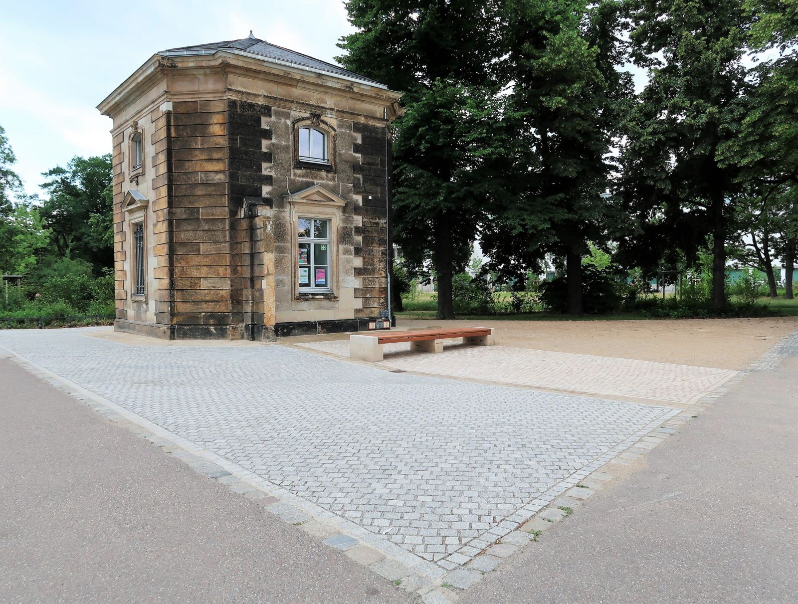 Von den vielen Pavillons, Kleinbauten und Tempeln des Parkes blieb als einzige Kleinarchitektur das Torhaus an der Lingnerallee erhalten. Parallel zur Parkgestaltung wurde die Sanierung des Torhausumfeldes umgesetzt, die angrenzenden Freiflächen barrierefrei in die Parkgestaltung eingebunden.