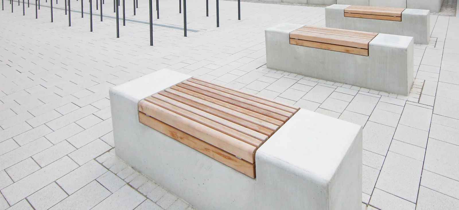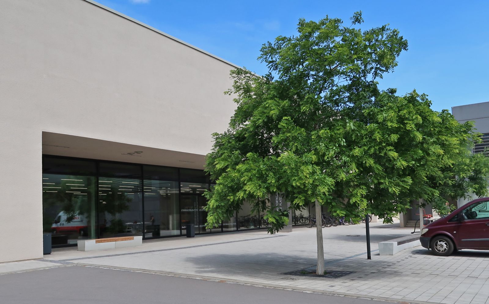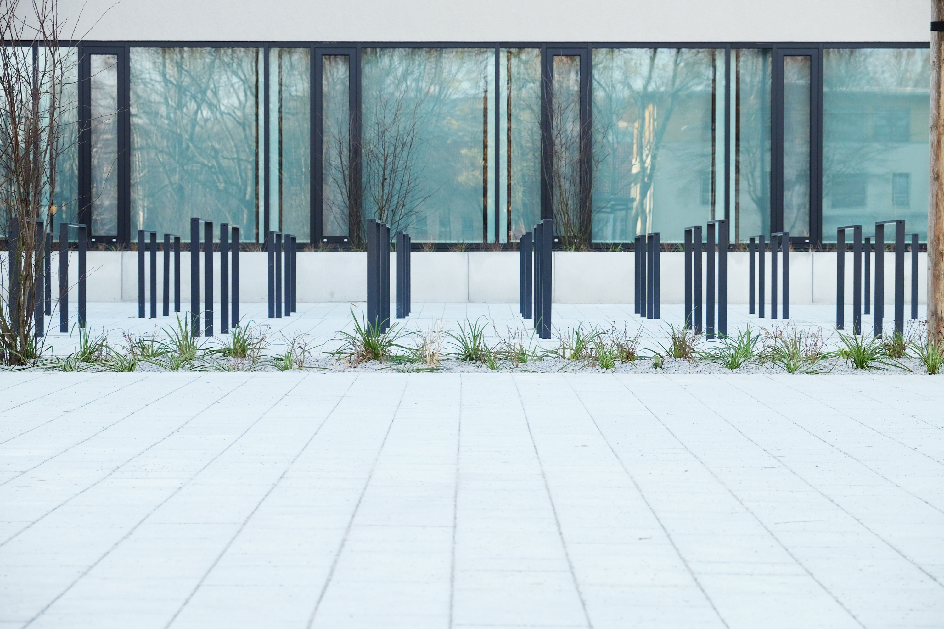 Die bestehenden Freiflächen vor der denkmalgeschützten Schwimmhalle blieben in ihrer Grundanlage erhalten. Erneuert und ergänzt wurden die Pflanzflächen durch blühende Gehölze, Staudenmischpflanzungen und Blumenzwiebeln.