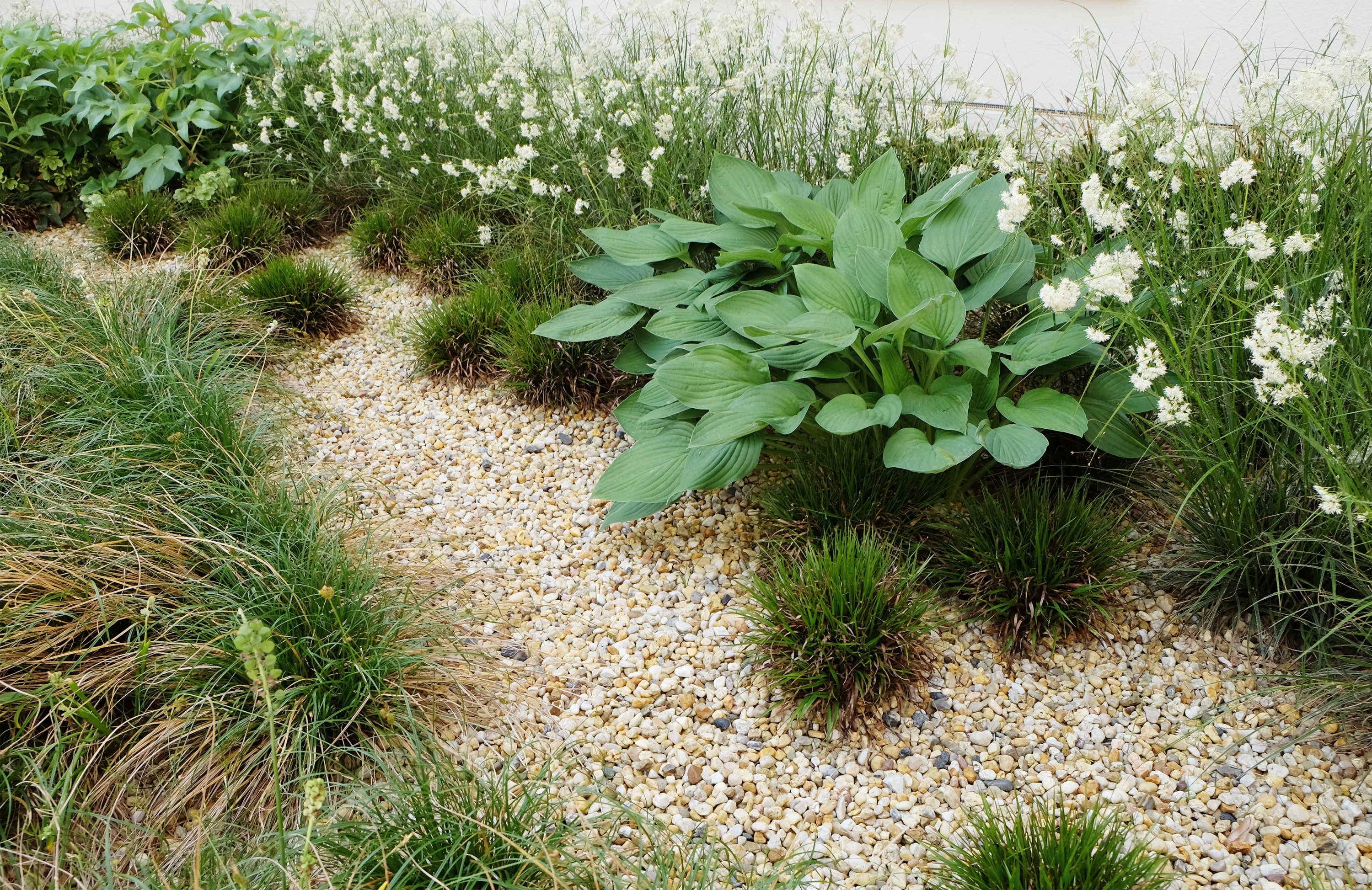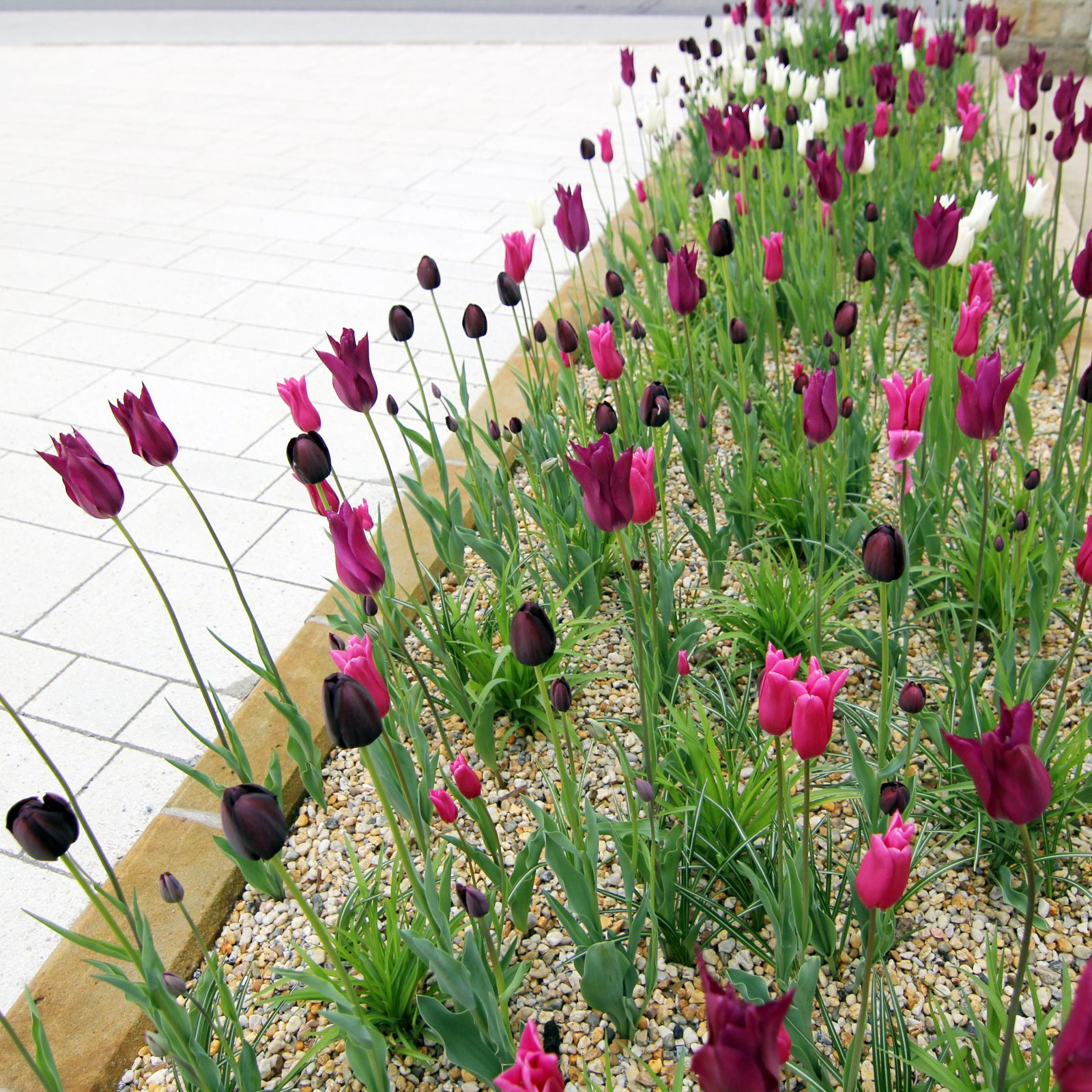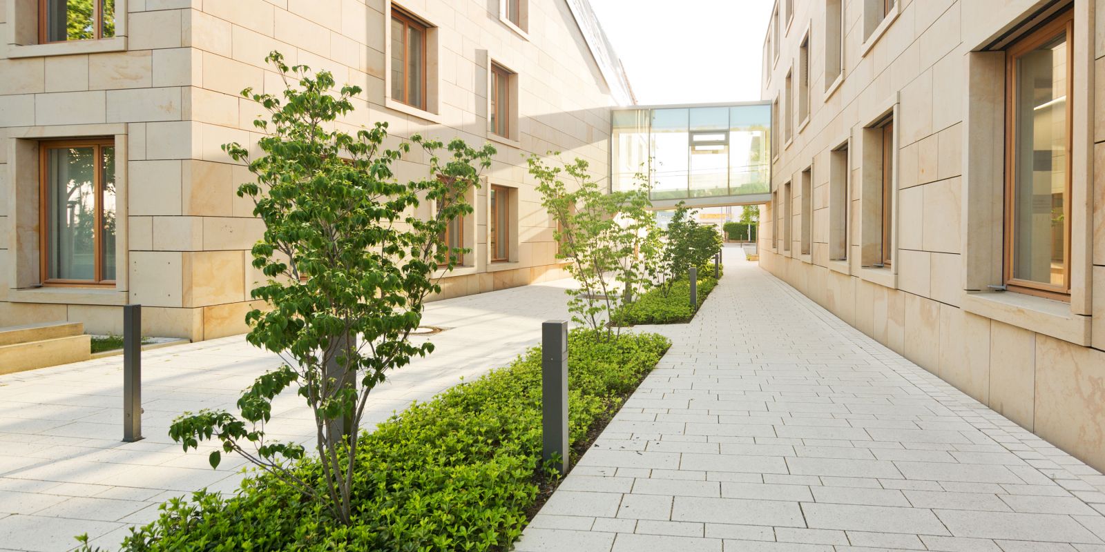 Für die größtenteils eher schattigen Pflanzflächen in den drei Innenhöfen wurde eine Mischung aus Stauden (verschiedene Blattstrukturen, weißblühend), Gräsern und Bodendeckern verwendet. Sie soll für lichte Akzente in den Innenhöfen sorgen. Die Flächen des mittleren Hofes befinden sich über dem Archiv des Finanzamtes und waren als fachgerechte Dachbegrünung auszuführen.