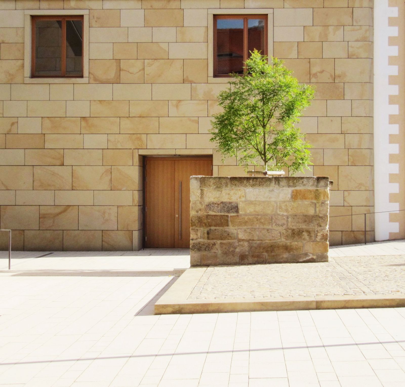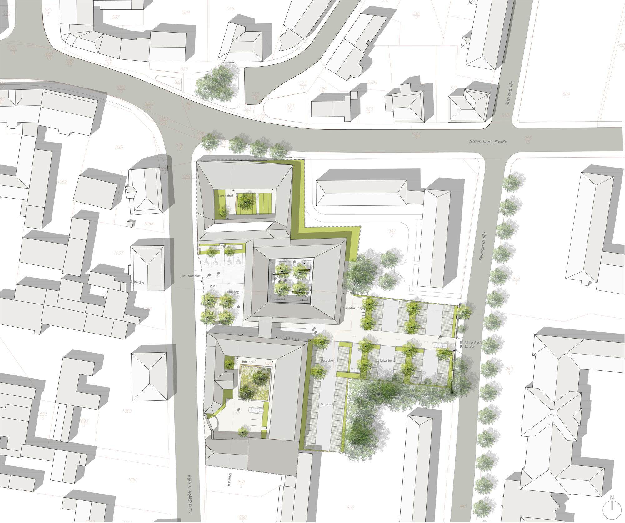 Neben der Beziehung der Außenanlage zu dem neu entstandenen Gebäudekomplex bestand eine besondere Herausforderung darin, sowohl die geschichtliche Entwicklung des Geländes als auch die sich über die Jahre der Brachlage herausgebildeten Fauna zu berücksichtigen. So wurden u.a. der Gewölbekeller an der Clara-Zetkin-Straße und die vorhandenen Sandsteinmauern in den Entwurf integriert.