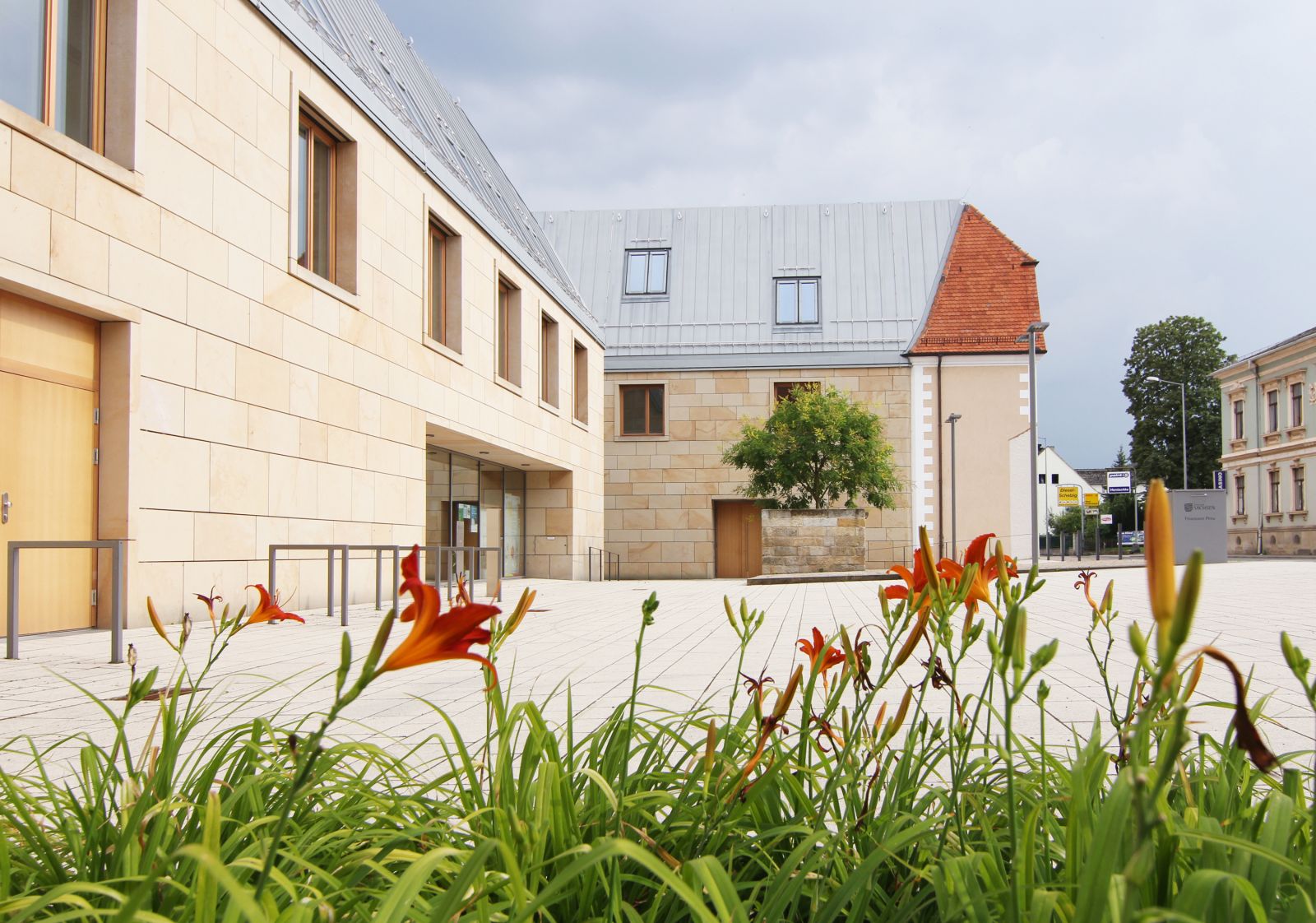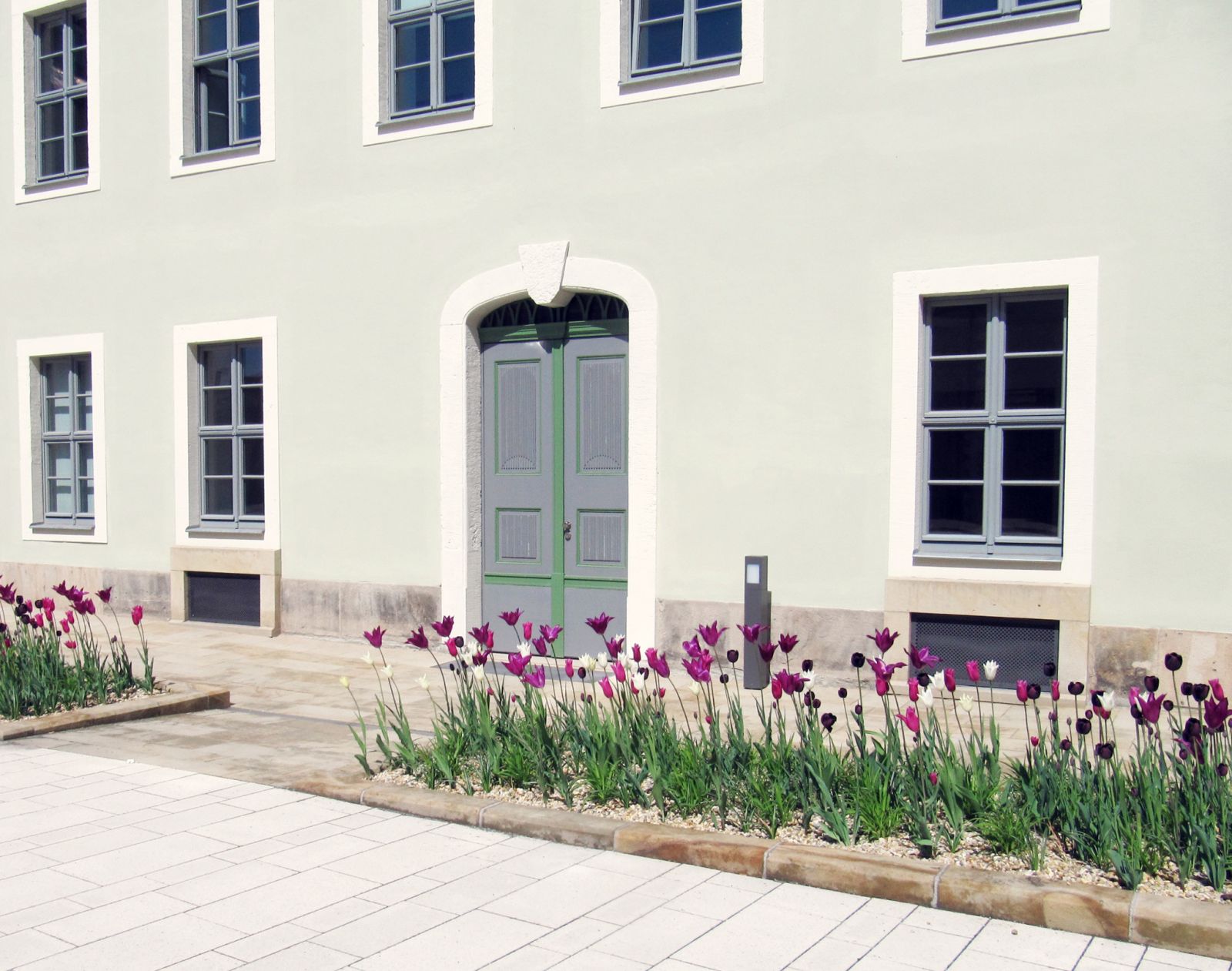 Der städtische zentrumsnahe Vorplatz dient als Ankunftsbereich und bietet neben Abstellmöglichkeiten für Fahrräder mit einer großzügigen Kante aus Sandstein eine Warte- und Verweilmöglichkeit im Bereich des vorhandenen Gewölbekellers, welcher dafür fachgerecht zu überbauen war. Die Platz- und Gehwegflächen wurden überwiegend mit Betonpflasterplatten in warmen Beige-Grautönen in Reihe belegt. Die historisch relevanten Bereiche auf dem Vorplatz wurden jedoch durch Verwendung von Belegen aus Sandstein gekennzeichnet (Fläche oberhalb des Gewölbekellers, Eingangsbereich ehemaliges Waisenhaus, Markierung historische Mauer). Sie sind ein wichtiges Zeugnis der Kulturgeschichte und werden in die Gestaltung aufgenommen.