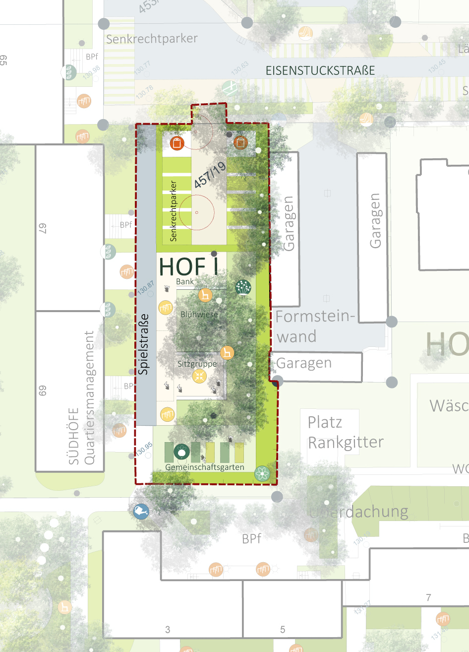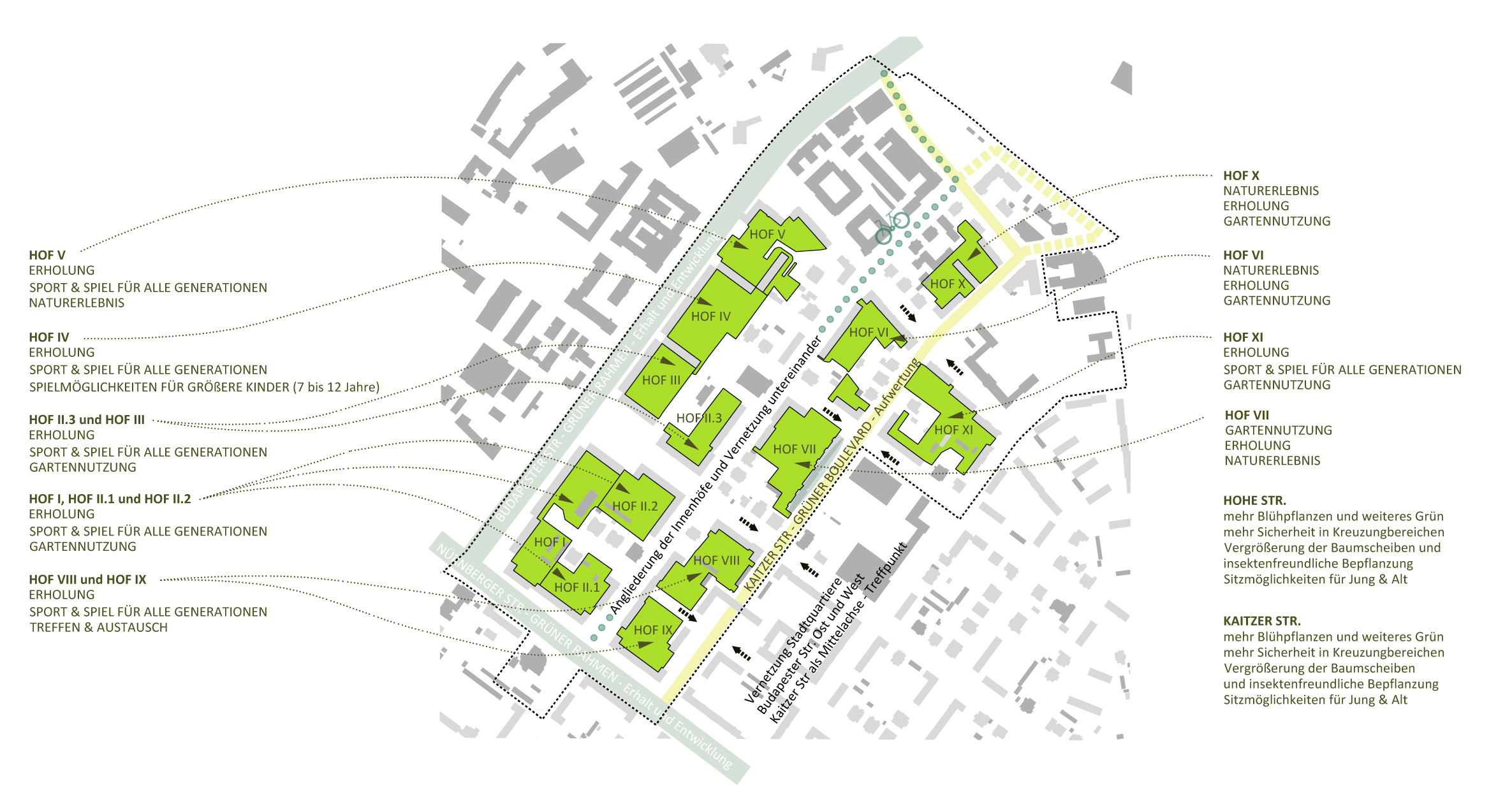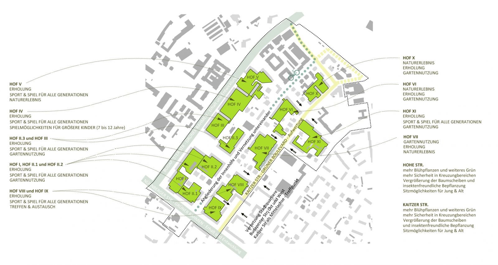 An die Struktur von öffentlichen Straßenräumen schließen sich die für das Gebiet typischen Wohninnenhöfe an. Diese werden ihrer Charakteristik entsprechend entwickelt. Gezielte Angebote verbinden in Zukunft verschiedene Nutzergruppen und regen zu hofübergreifenden Besuchen an.