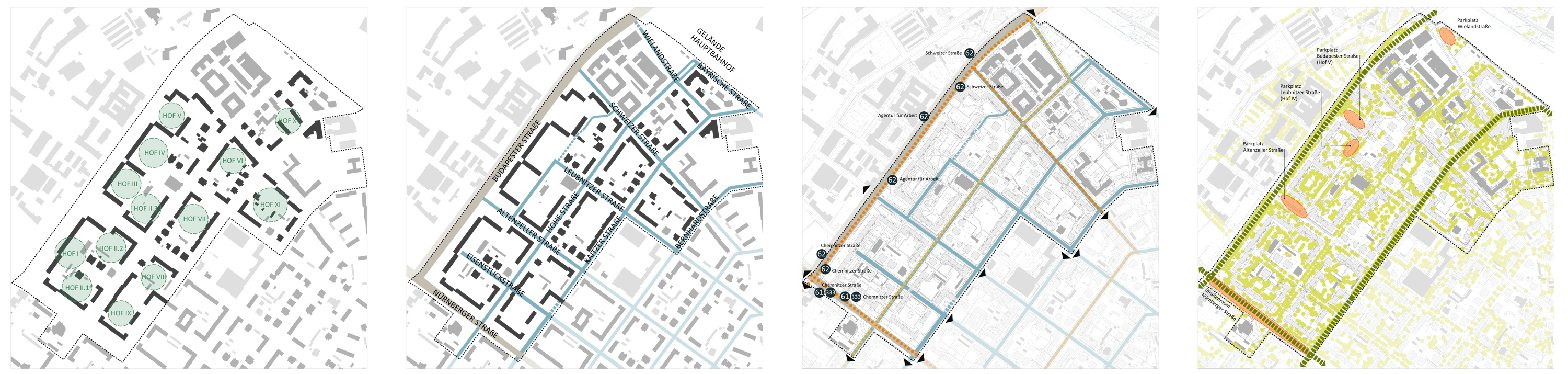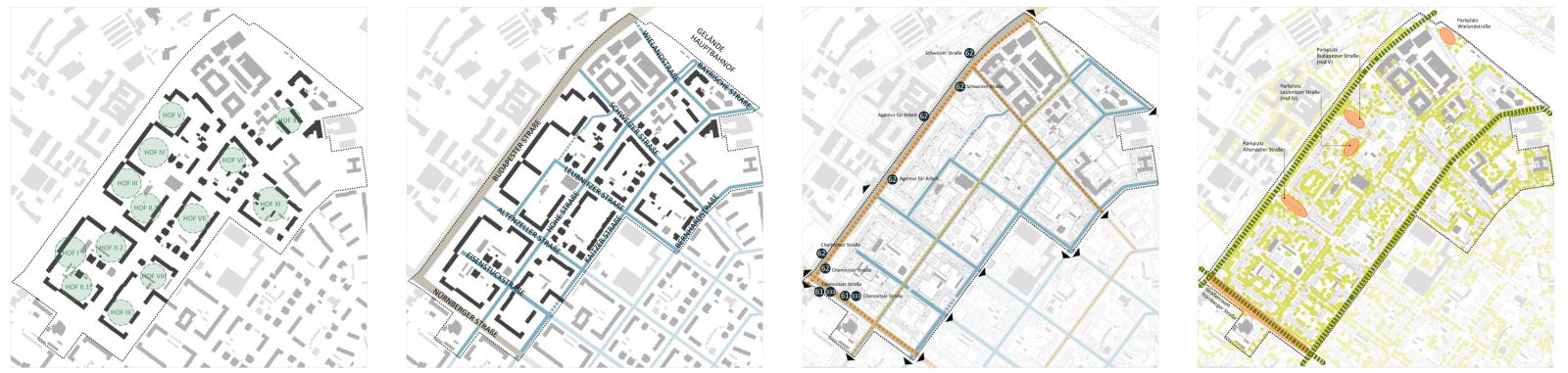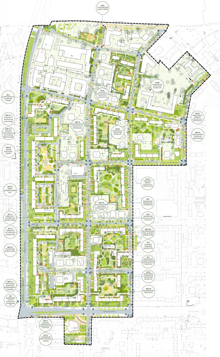 An die Struktur von öffentlichen Straßenräumen schließen sich die für das Gebiet typischen Wohninnenhöfe an. Diese werden ihrer Charakteristik entsprechend entwickelt. Gezielte Angebote verbinden in Zukunft verschiedene Nutzergruppen und regen zu hofübergreifenden Besuchen an.