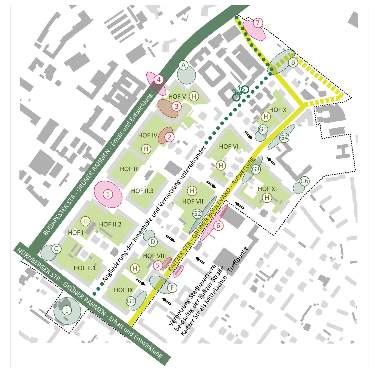 Mit dem Freiraumkonzept werden die genannten übergeordneten Ziele für die Vernetzung der Freiräume verfolgt und damit ein quartiersumgreifender Grün- und Freiraumverbund geschaffen. Besondere Freiraumpotentiale und Handlungsbedarfe wurden erkannt, die Aufwertung dieser Bereiche und Integration in den übergreifenden Freiraumverbund sind Schwerpunkte der Planung.