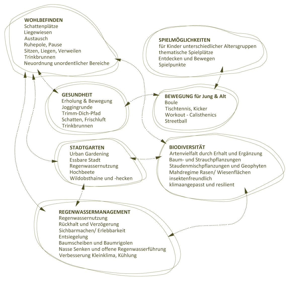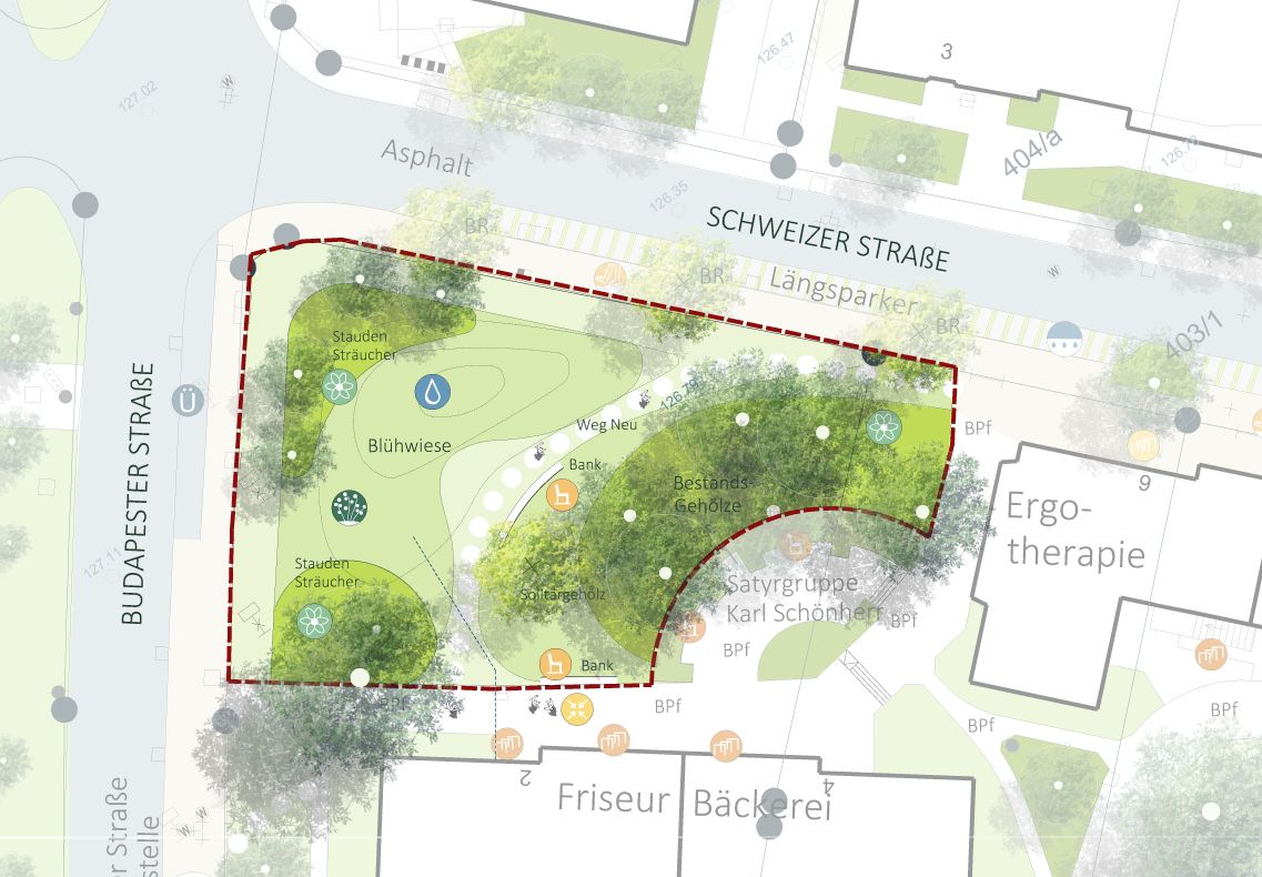 Im Ergebnis der vorgenommenen Strukturanalyse, der vor Ort aufgenommenen Bestandssituation und aller ermittelten Nutzungsbedarfe wurde für das Fördergebiet „Budapester Straße Ost“ ein gebietsumfassendes Freiraumkonzept erstellt.