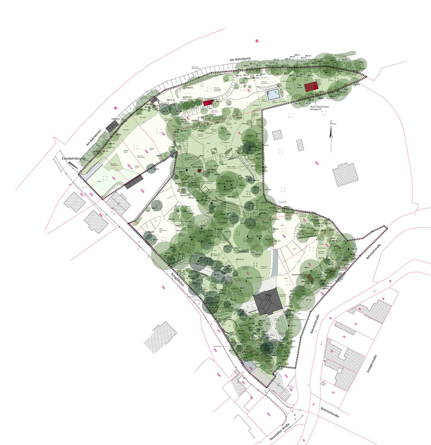 - Erfassung und Bewertung des Bestandes an Gehölzen, Grünland, Wegen, Treppen sowie sonst. Ausstattungen nach den Kriterien des gartendenkmalpflegerischen Erhalts und der Verkehrssicherheit,