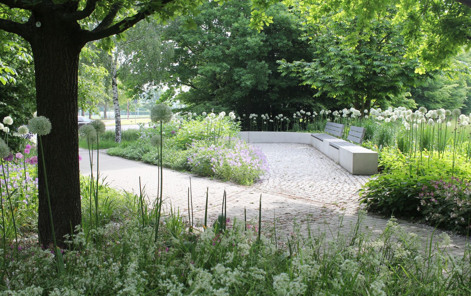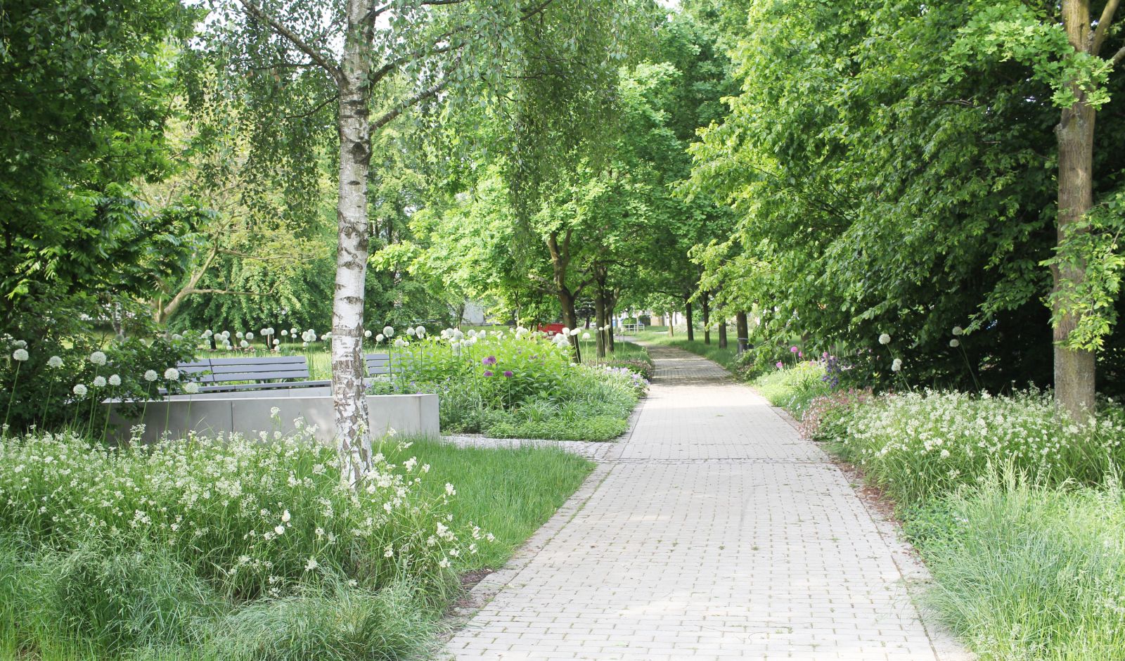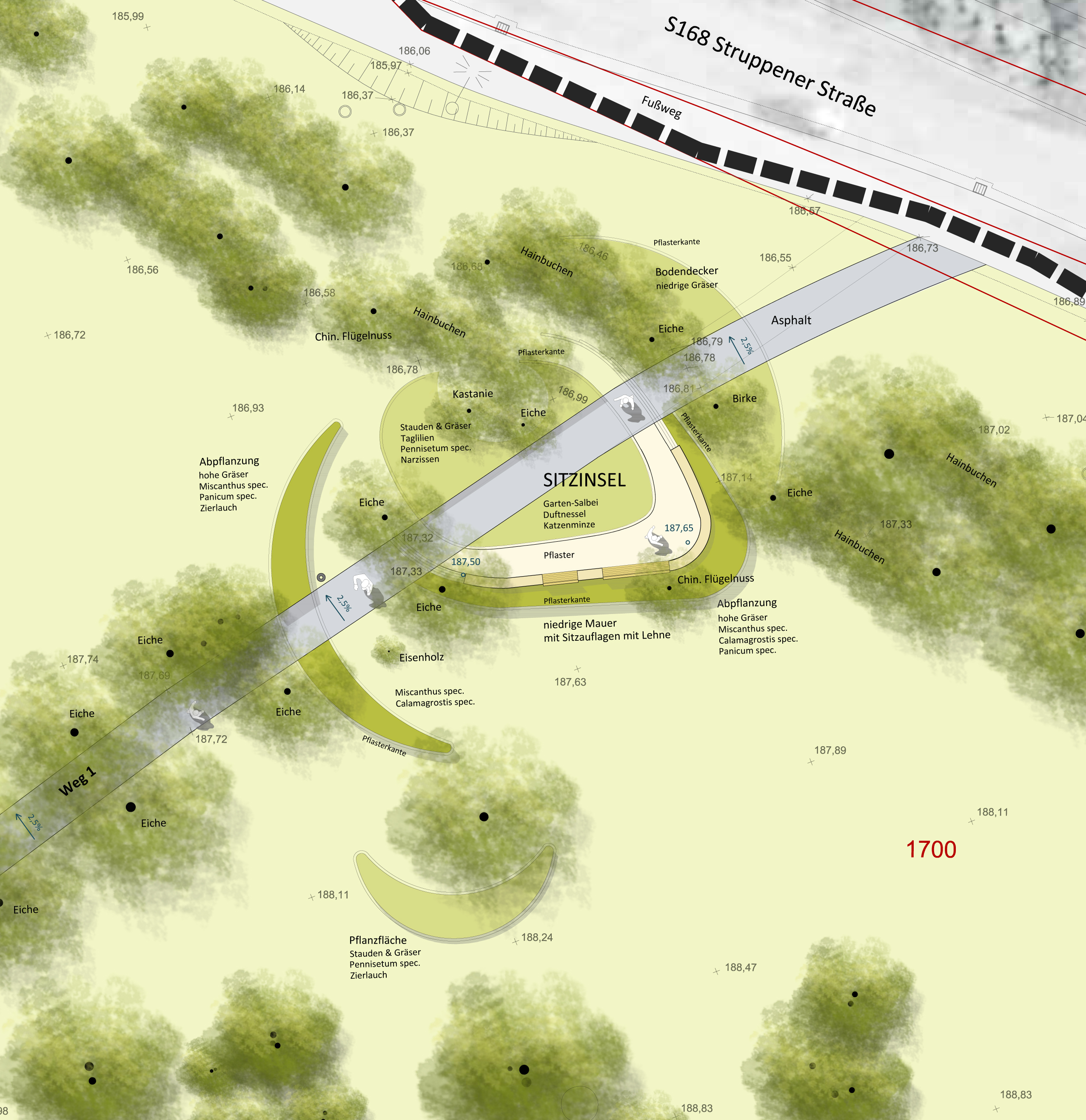 Planungsgegenstand war die Grünanlage an der Struppener Straße in Pirna mit dem Ziel die Aufenthaltsqualität der als Straßenabstandsgrün wirkenden Fläche zu erhöhen. Die Grünanlage sollte künftig als öffentlicher Raum mit Parkcharakter erlebbar sein. Dies sollte zum einen durch die Erneuerung der beiden Hauptwege und zum anderen durch die Neuanlage von Sitz- bzw. Ruhebereichen entlang der Wege erfolgen. In der Wegeführung waren aufgrund fehlender Anbindungen Anpassungen erforderlich, das Wegesystem in seinem Verlauf ist jedoch erhalten geblieben. Unter Berücksichtigung des bestehenden Baumbestandes wurden zwei Sitzplätze entlang der Wege integriert. Zur Einbindung der beiden Sitzbereiche in die Grünanlage dienen flächige Pflanzungen aus hohen Gräser-Arten und Stauden mit Blühfarben in verschiedenen Nuancen von Blau bis Violett. Durch die Neugestaltung und Erhöhung der Funktionalität der Grünfläche an der Struppener Straße wird dieser ein eigenständiger Charakter verliehen.