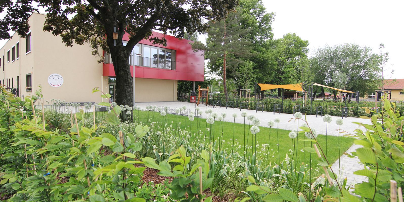 Aufgrund der Änderung der Lage des geplanten Gebäudes gegenüber dem Bestand musste insbesondere der gesamte Erschließungs- und Wirtschaftsbereich sowie der Abbruchbereich des Altgebäudes neu geplant und gestaltet werden. Neben der Neuordnung der Erschließungsflächen ist eine Anpassung und der Entwurf neuer Spielbereiche notwendig. Die Wünsche und Anforderungen des Nutzers werden berücksichtigt und gleichzeitig die Barrierefreiheit der Freiflächen umgesetzt.