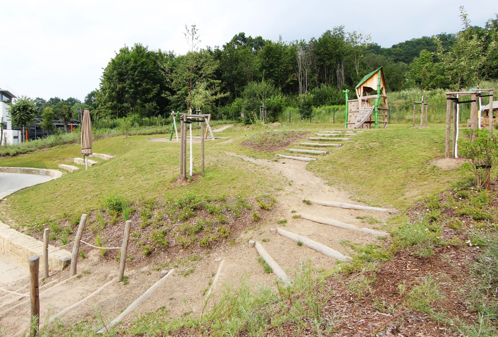 In diesem Teilbereich befinden sich Gehölzgruppen und Einzelgehölze mit besonderen Vegetationsaspekten, die zum ‘Rumstromern‘, ‘Entdecken‘ und ‘Verstecken‘ einladen. Im Anschluss befindet sich der nicht gestaltete, waldähnliche Bereich des Geländes. Dieser ist mit einem Zaun eingefriedet und vom restlichen Außenspielbereich der Kindertagesstätte am Reitplatz getrennt. Da er aber über ein Tor erreichbar ist, steht dieser Bereich auch für eine extensive und betreute Nutzung zur Verfügung. Eine große am Gebäude entlang laufende Terrasse erleichtert an der Südseite den Zugang zu allen Gruppenräumen und ermöglicht einen fließenden Übergang von Innen in den Außenraum. Weiterhin stellt sie eine Verbindung zu den südlich gelegenen Sandspielflächen der Krippe und der Sandspielanlage des Kindergartens her. Beschattet werden diese Flächen von mehreren fest installierten Sonnenschirmen. Durch ausreichend Rasenflächen, leichte Bodenmodellierung und Gehölzpflanzungen wird Abwechslung für freies Spielen geschaffen.
