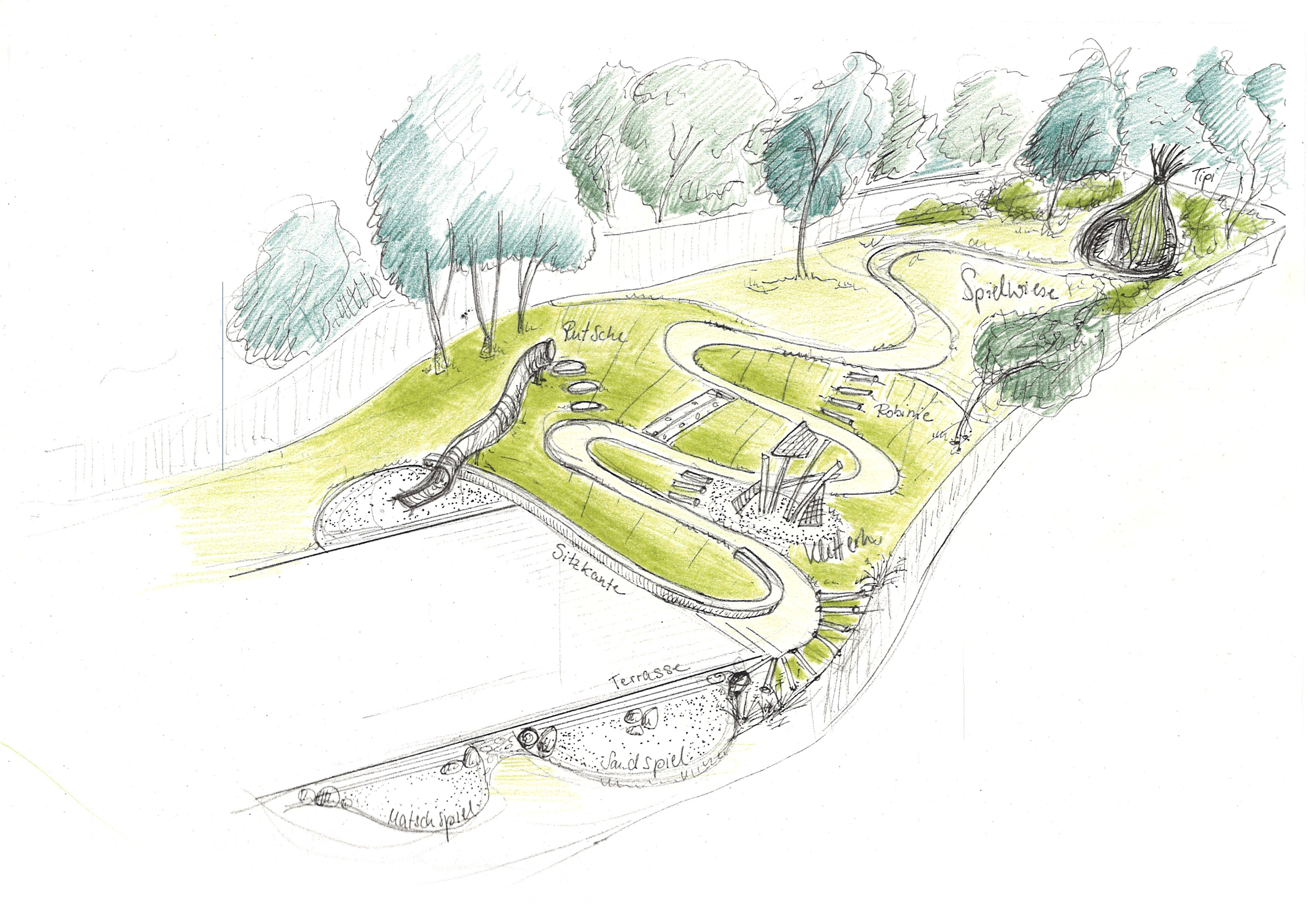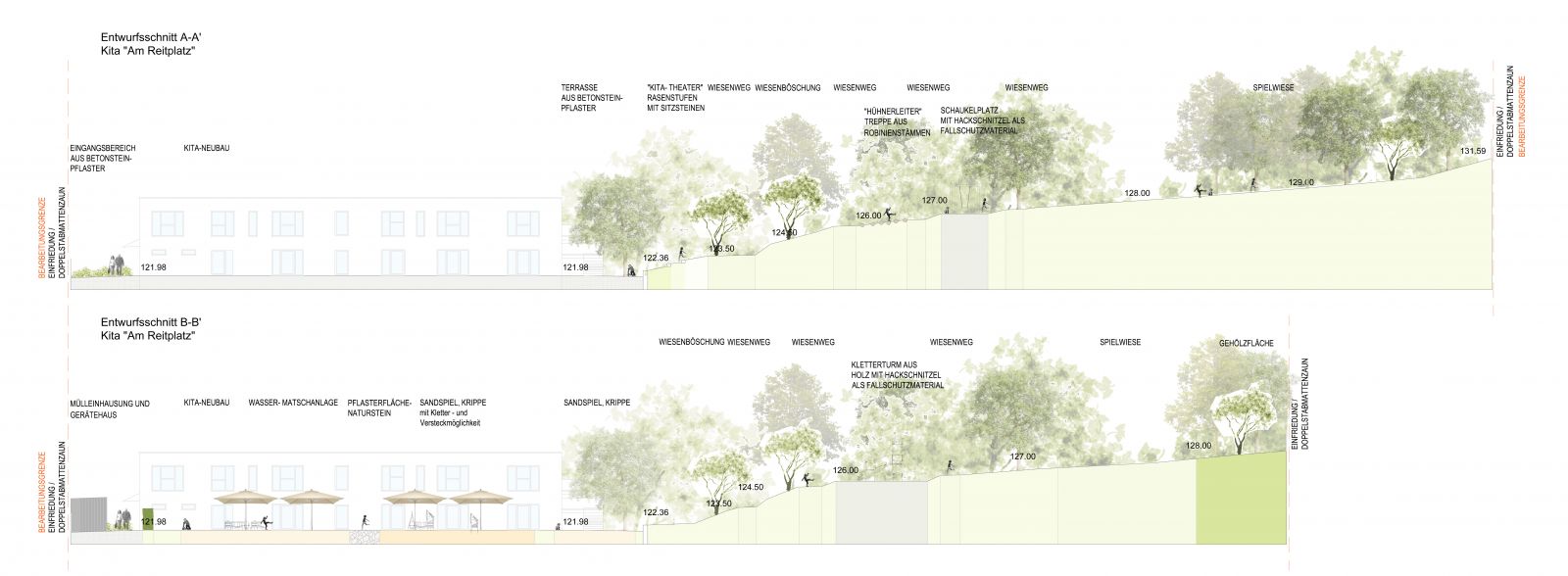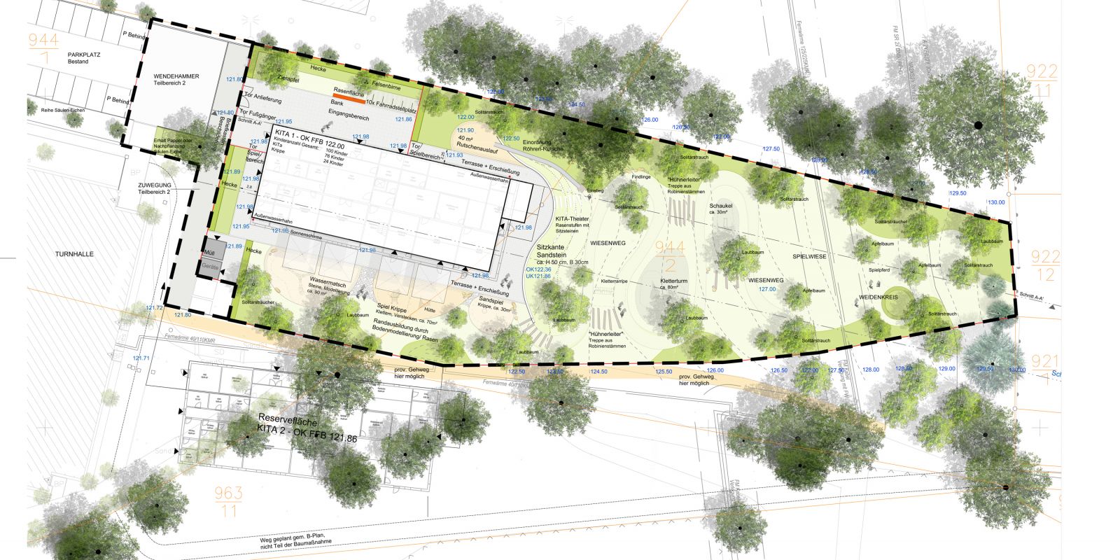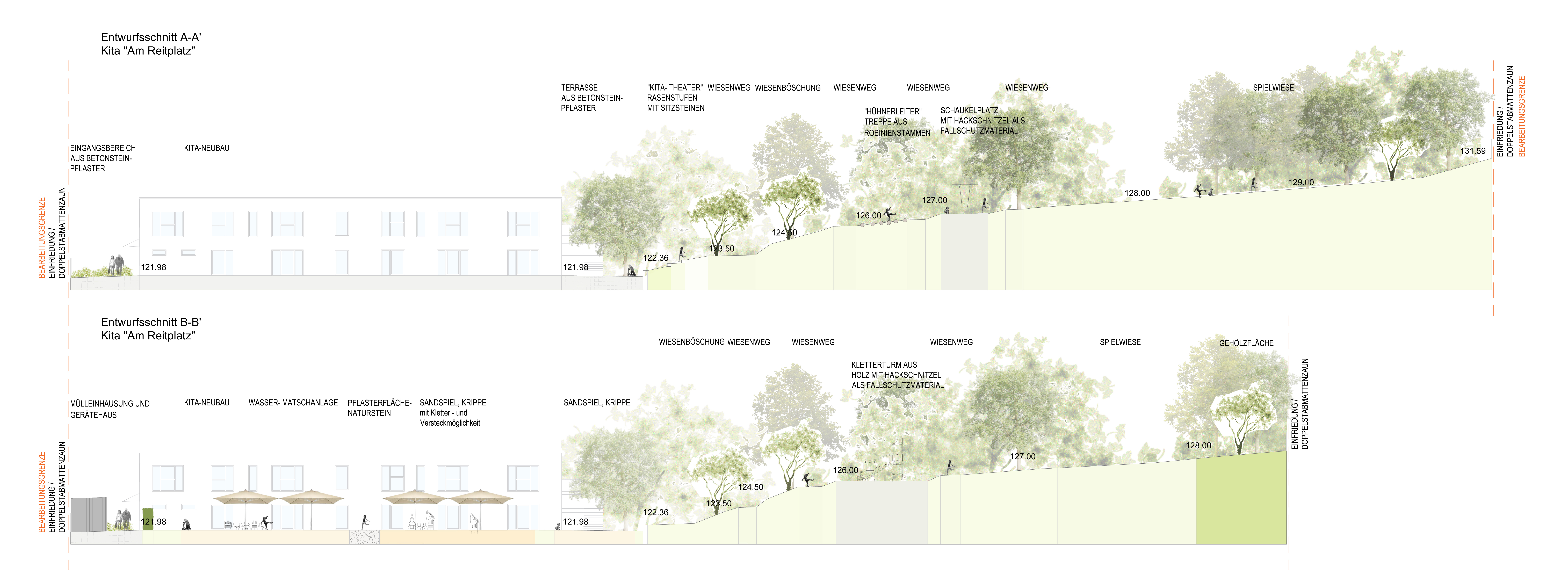 Die Gestaltung der Außenanlagen der Kindertagesstätte Am Reitplatz „Limonadenbaum“ in Pirna orientierte sich an den Entwicklungsbedürfnissen der Kinder und an den Wünschen und Vorgaben der Nutzer. Die Nutzungsbelegung des zweigeschossigen Kindergartengebäudes sah 76 Kindergartenplätze und 24 Krippenplätze vor. Eine besondere Herausforderung stellte bei der Planung der Freifläche für die Kindertagesstätte die Topografie des Geländes dar. Mit einem Höhenunterschied von ca. 10 m muss hier eine interessante, phantasievolle und funktionierende Lösung für die Erschließung der Spielflächen gefunden werden. Die Freifläche gliedert sich funktionell in den westlich und nördlich des Gebäudes liegenden Zugangsbereich mit Wirtschaftsflächen, Fahrradabstellflächen und dem Haupteingang des Gebäudes, in einen südlichen Spielbereich in unmittelbarer Nähe des Gebäudes und einen großzügigen und frei gestalteten Spielbereich am Hang im Osten des Grundstücks. Im Osten des Gebäudes bildet die Terrasse den Übergang zum steilen und freier gestalteten Spielbereich. An dieser Stelle wird die Topografie genutzt und ein Kita-Theater aus Rasenstufen mit Sitzsteinen etabliert. Der steile Spielbereich des Kindergartens wird über einen Wiesenweg in Form von mehreren Serpentinen erschlossen. Dabei bildet schon der Wiesenweg reichlich Abenteuerpotenzial, mit „Hühnerleitern“, Treppen aus Robinienstämmen, sind einzelne Spielinseln in den Kurven des Weges erreichbar.