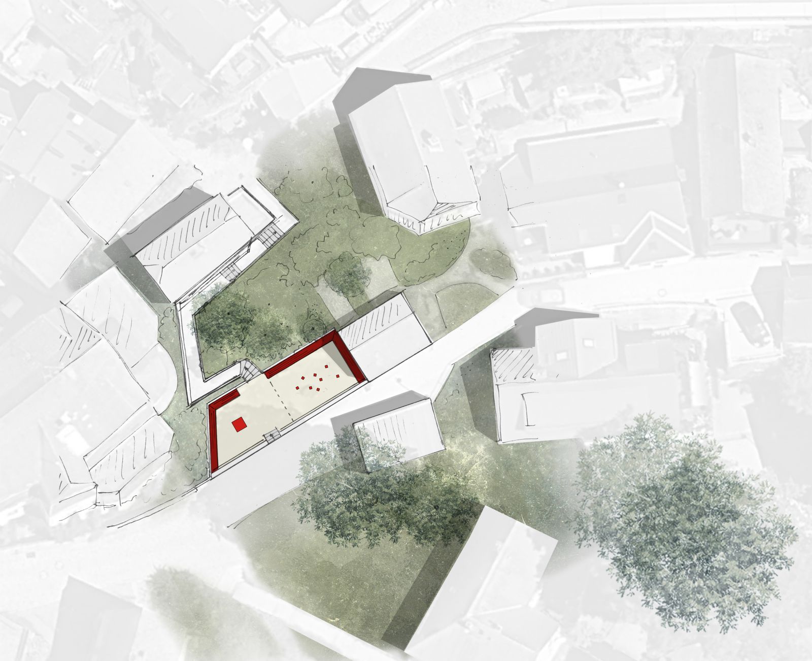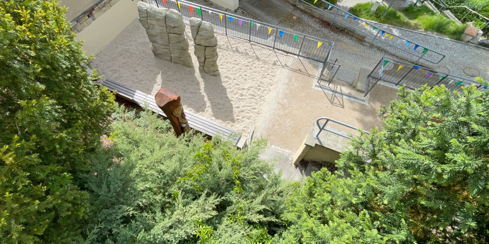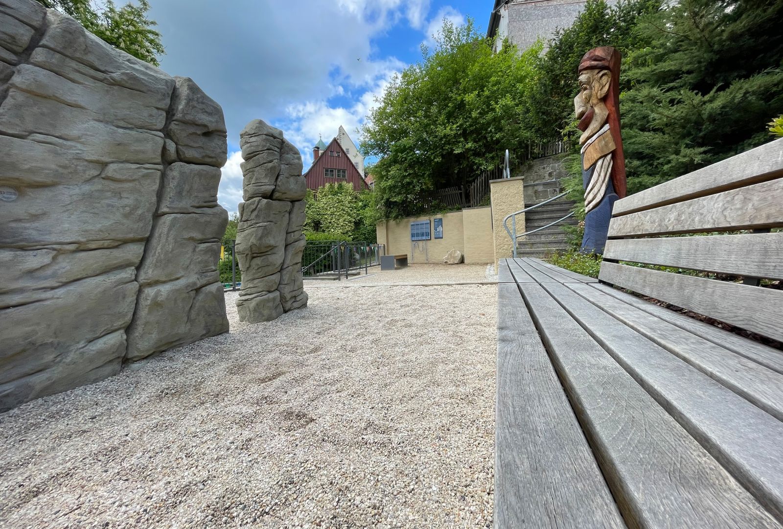 Künftig ergänzen ein Kletterfelsen, großzügige Sitzmöglichkeiten und Informationstafeln zum Thema Klettern die Fläche. Im Planungsumfang enthalten war außerdem die Sanierung der Stützmauer, der Treppenanlage und die Sicherung der erhöht gelegenen Platzfläche durch ein neues Geländer. Blühsträucher vervollständigen den grünen Rahmen um den neu geschaffenen Aufenthaltsort.