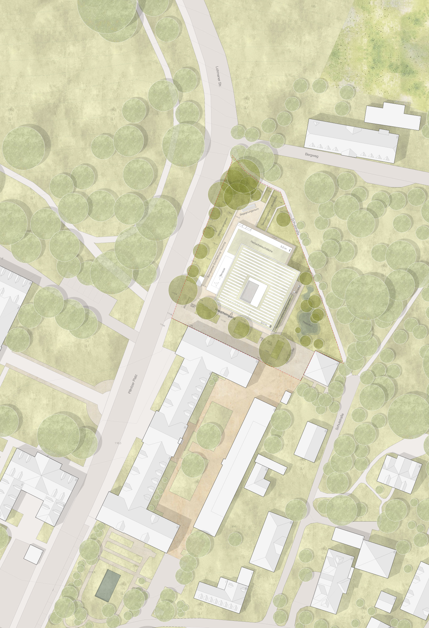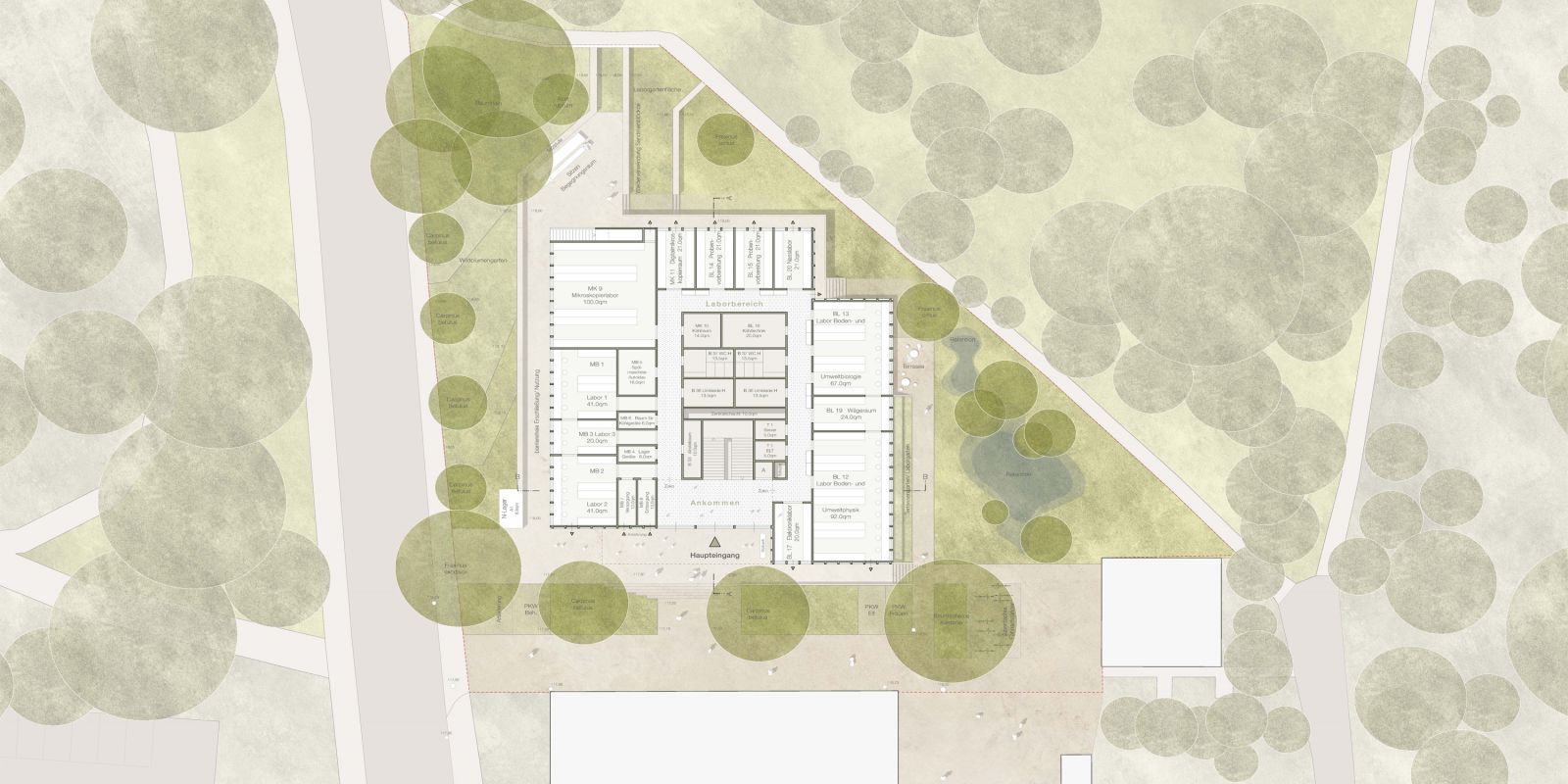 Die Anlage von klimaresilienten Pflanzungen im Vorgartenbereich (Pillnitzer Platz) und großzügig dimensionierten begrünten Baumscheiben erhöhen die Biodiversität und tragen künftig zur Eingrünung des Baukörpers bei. Nördlich des Gebäudes bietet die terrassierte Gartenfläche Potential für die Anlage eines Laborgartens bzw. für Versuchspflanzungen. Die innerhalb des Baukörpers verortete Funktion einer Lern- und Forschungseinrichtung wird somit, neben der Anlage eines Dachgartens, in den Außenraum erweitert. Im hinteren Gartenbereich bleibt der Wiesenraum mit vorhandenen Retentionsmulden erhalten.