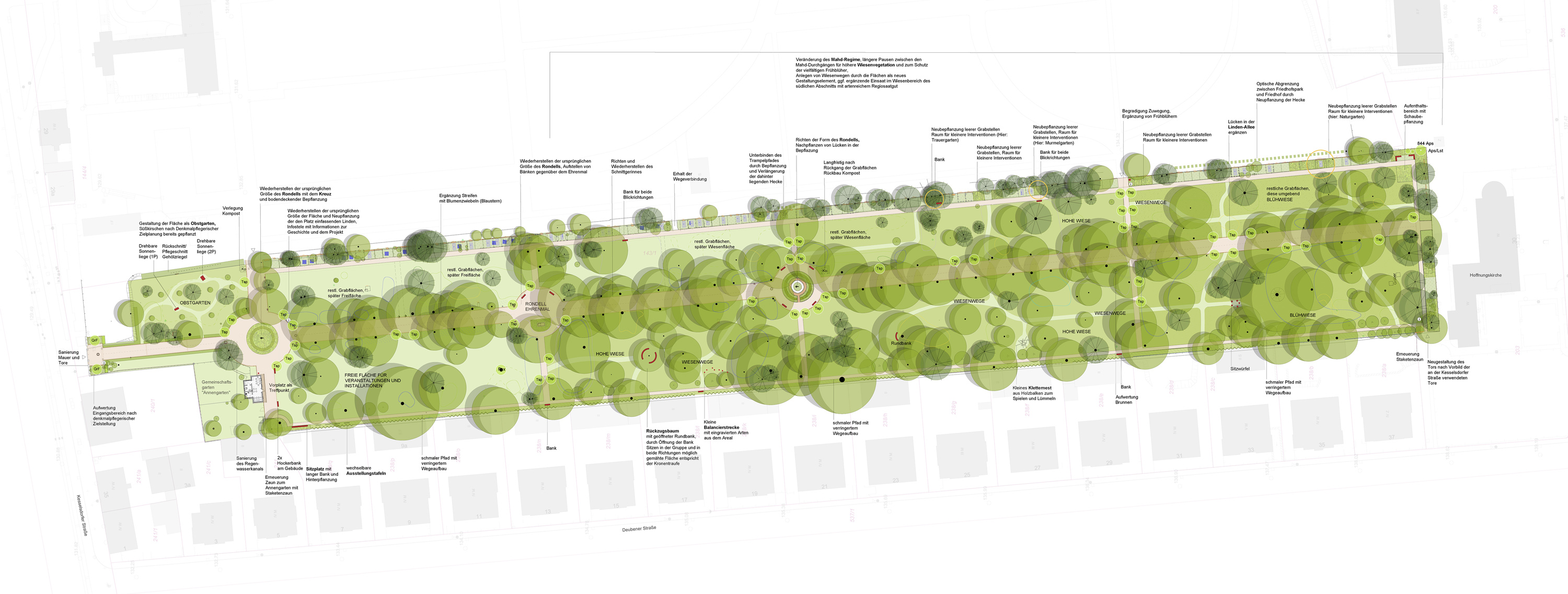 Der schon seit vielen Jahren aus der aktiven Friedhofsnutzung herausgenommene örtliche Teilbereich „Friede und Hoffnung“ soll gemäß Friedhofsentwicklungskonzeption der Stadt Dresden entwidmet werden und wurde für die Umgestaltung zu einem Parkbereich als geeignet eingestuft. Nicht mehr benötigte Bestattungsflächen sollen durch Umwandlung in Grünflächen das Defizit an öffentlichen Parks in den städtischen Quartieren reduzieren. Durch Ermöglichung freizeitlicher Nutzungen in diesem Abschnitt, durch den Ausbau und die Sanierung des Wegenetzes und die Integration von Aufenthalts- und Freizeitangeboten, können zudem die verbleibenden Abschnitte des Friedhofes entlastet werden, ohne dass der Friedhof seinen außergewöhnlichen Gesamtcharakter verliert. Ziel der Planung war es, einen generationenübergreifenden Begegnungsort zu schaffen, von dem sowohl Anwohner, Trauernde als auch die Friedhofsverwaltung profitieren sollen. Es erfolgte eine nachfrageorientierte und nutzerangepasste Freiraumentwicklung. Bei der Freiraumplanung sind sowohl zeitgenössische Elemente, als auch historisch-kulturelle Aspekte, ebenso wie die Ansprüche des Denkmal- sowie des Naturschutzes eingeflossen.