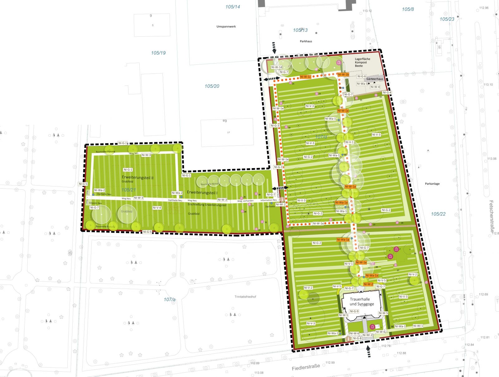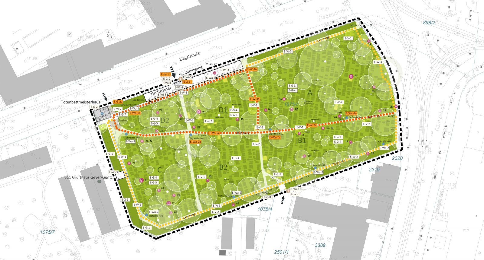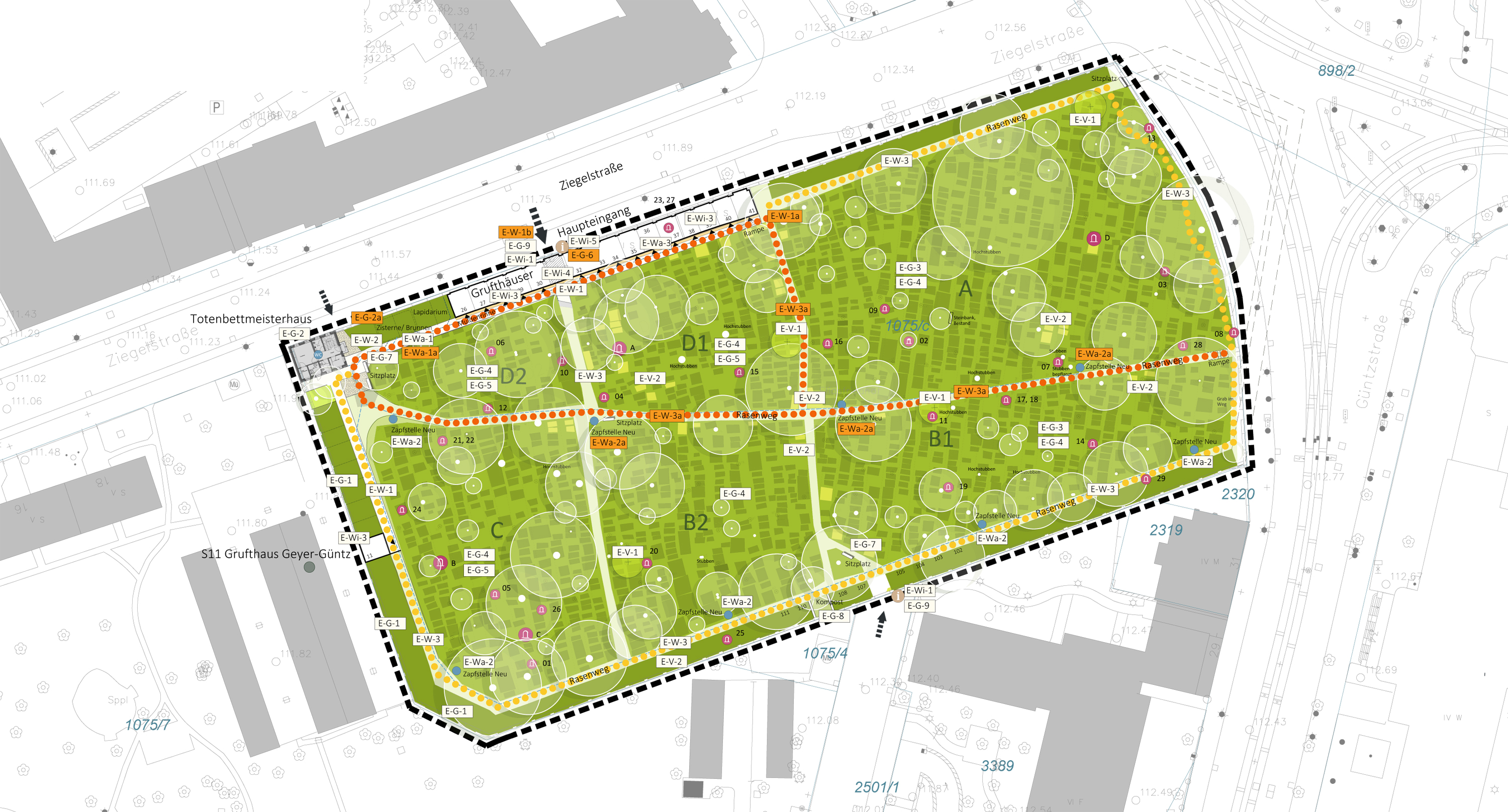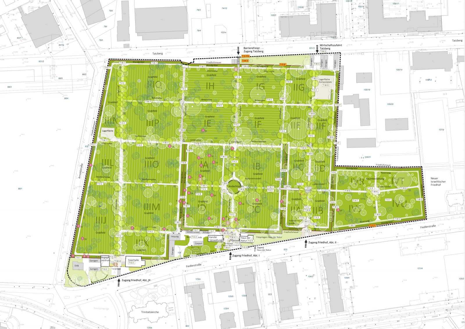 Außerdem wurden Vorschläge erarbeitet zur Nachpflanzung von Großgehölzen, zur Pflanzenverwendung unter Beachtung stadtklimaangepasster Arten, zur Aufwertung und Anreicherung vorhandener Vegetationsflächen. Zu beachten bei der Konzepterstellung war die Betrachtung der Friedhöfe als Sachgesamtheit und Gartendenkmal. Es gibt neben historischen Grabmälern und dem schützenswerten Gehölz- und Baumbestand auch bauliche Schutzgüter auf den einzelnen Friedhöfen.