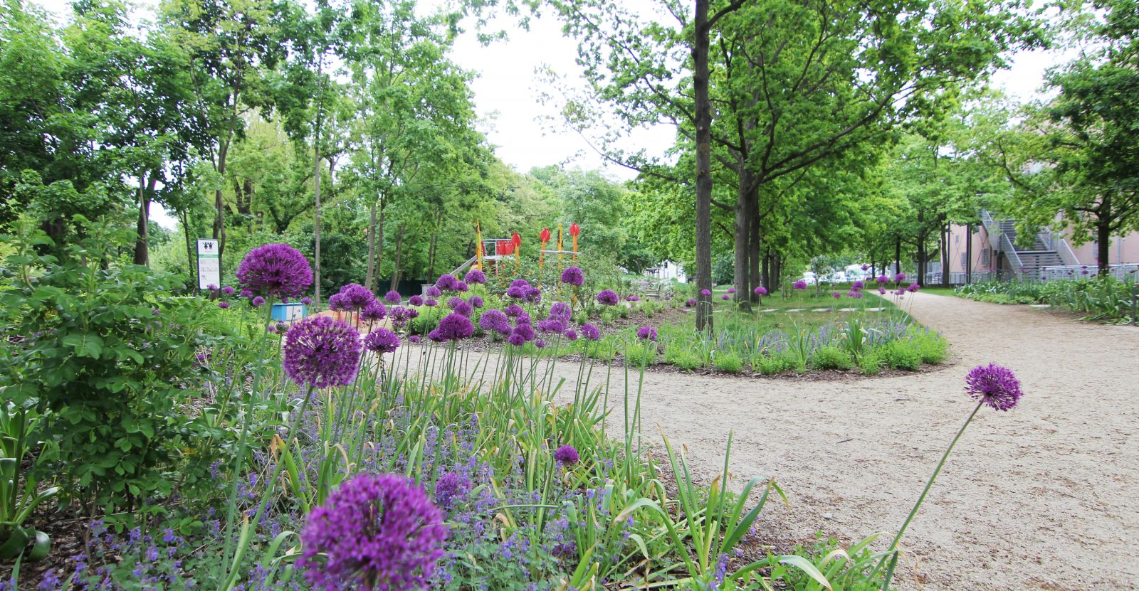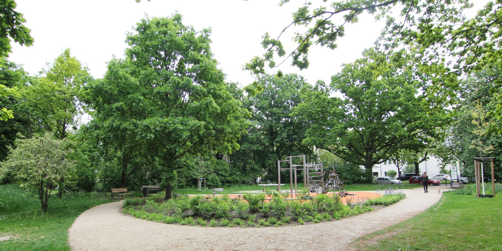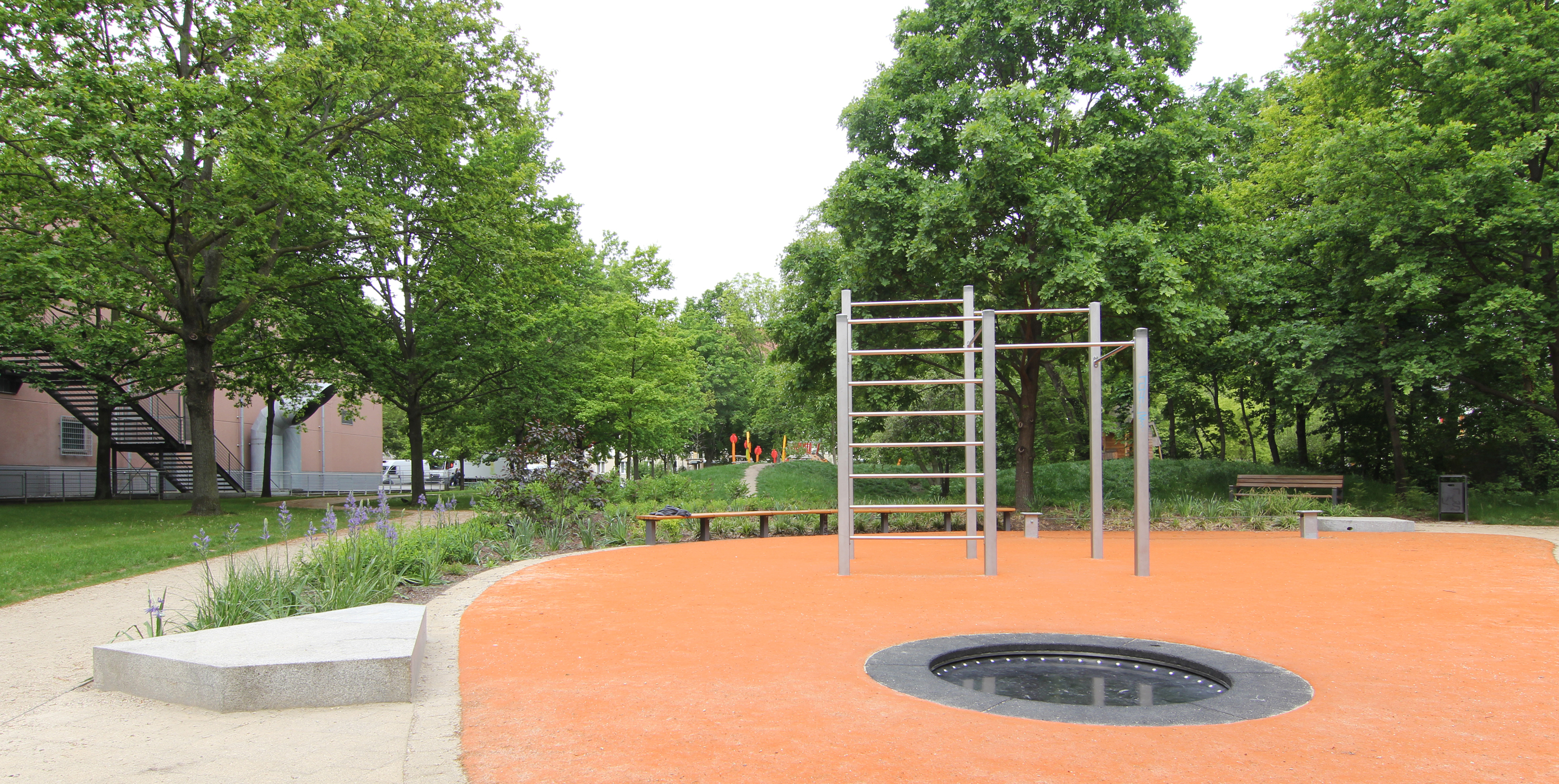 Der ruhigere Bereich für Kleinkinder und größere Kinder wurde in den Parkteil an der Tittmannstraße eingeordnet, da sich hier Wohnbebauung befindet. Der vorhandene Gehölzbewuchs wurde in die Anlage integriert und sorgt zusammen mit Bodenmodellierungen und ergänzender Bepflanzung für eine Abschirmung zur Wohnbebauung bzw. zum Straßenbereich.
