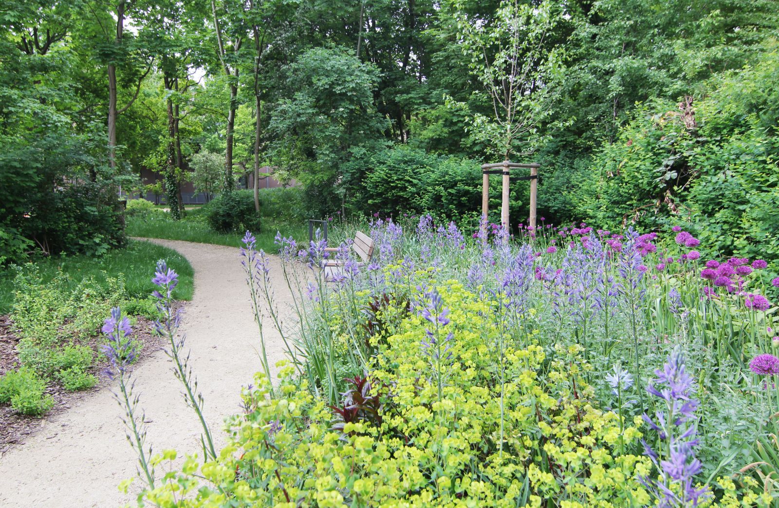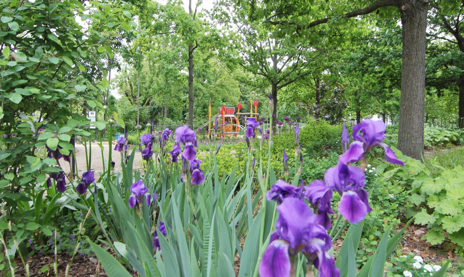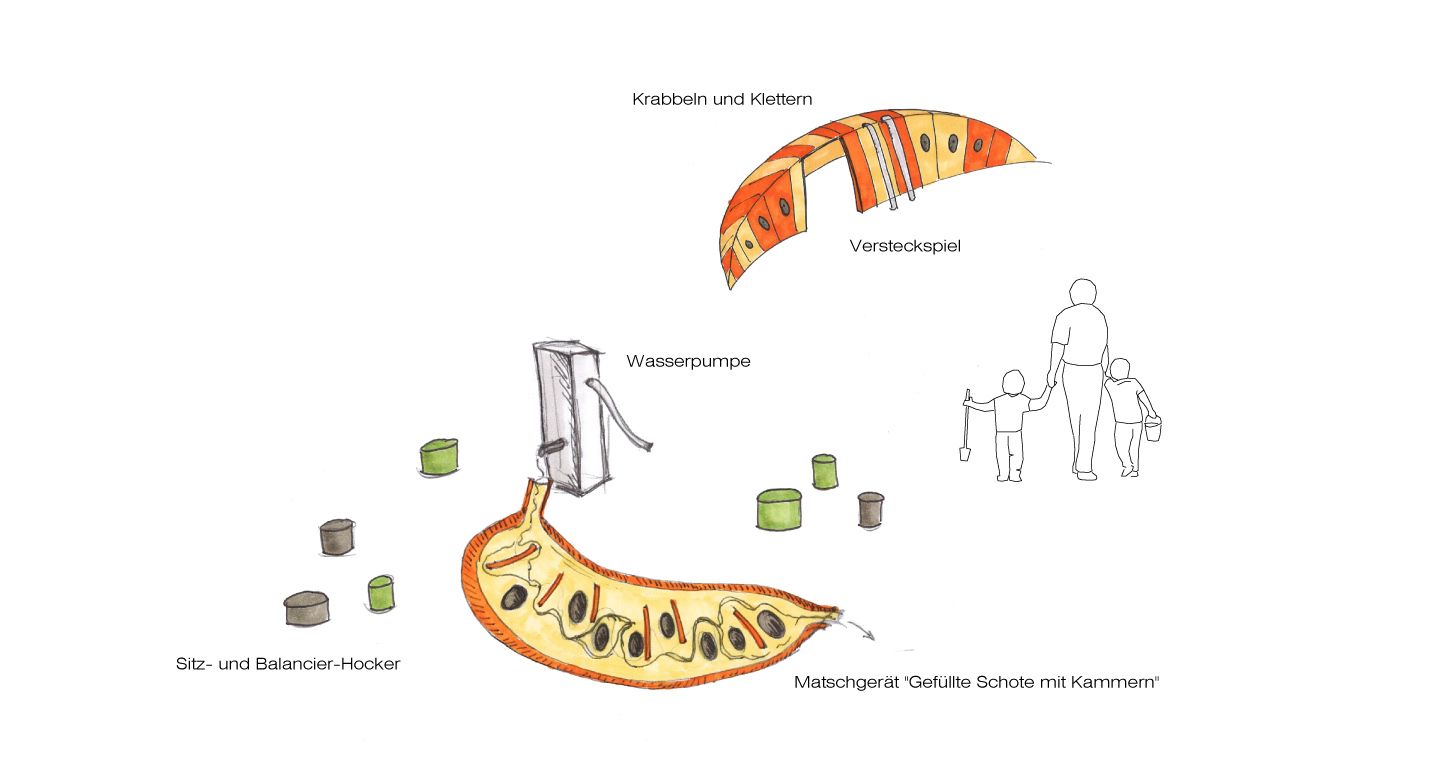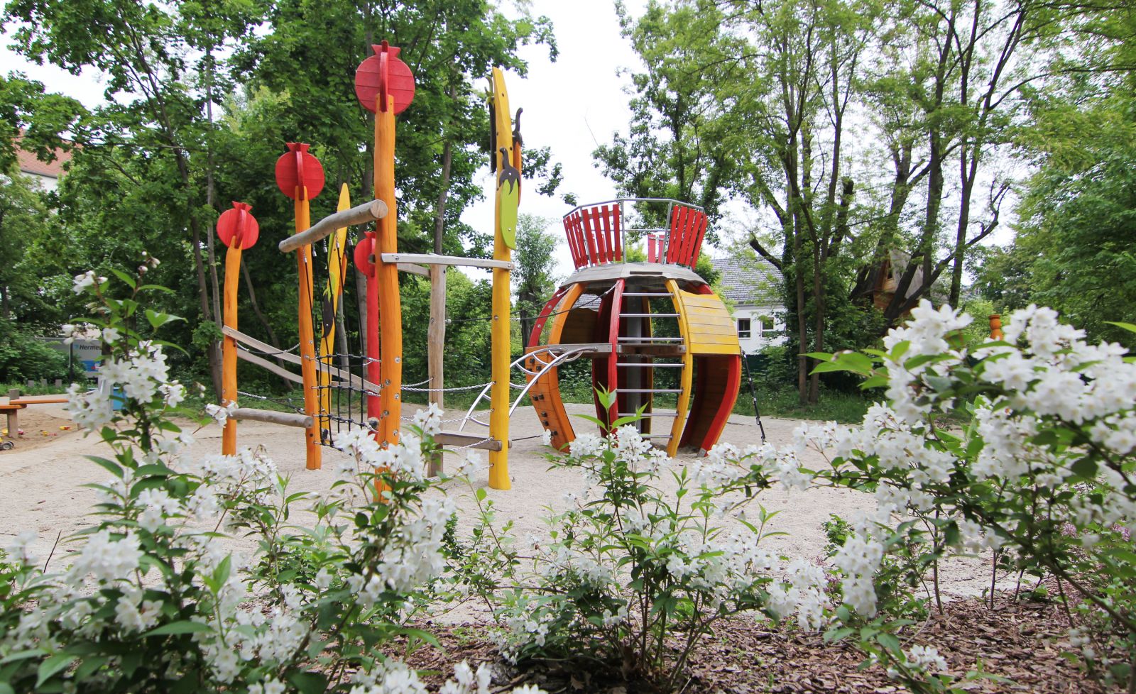 Der ruhigere Bereich für Kleinkinder und größere Kinder wurde in den Parkteil an der Tittmannstraße eingeordnet, da sich hier Wohnbebauung befindet. Der vorhandene Gehölzbewuchs wurde in die Anlage integriert und sorgt zusammen mit Bodenmodellierungen und ergänzender Bepflanzung für eine Abschirmung zur Wohnbebauung bzw. zum Straßenbereich.