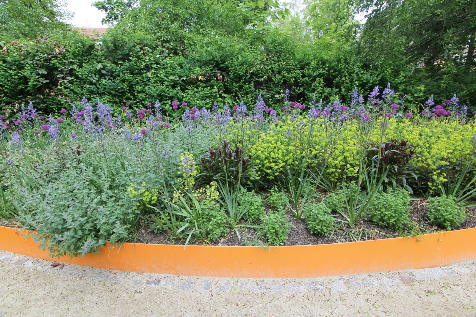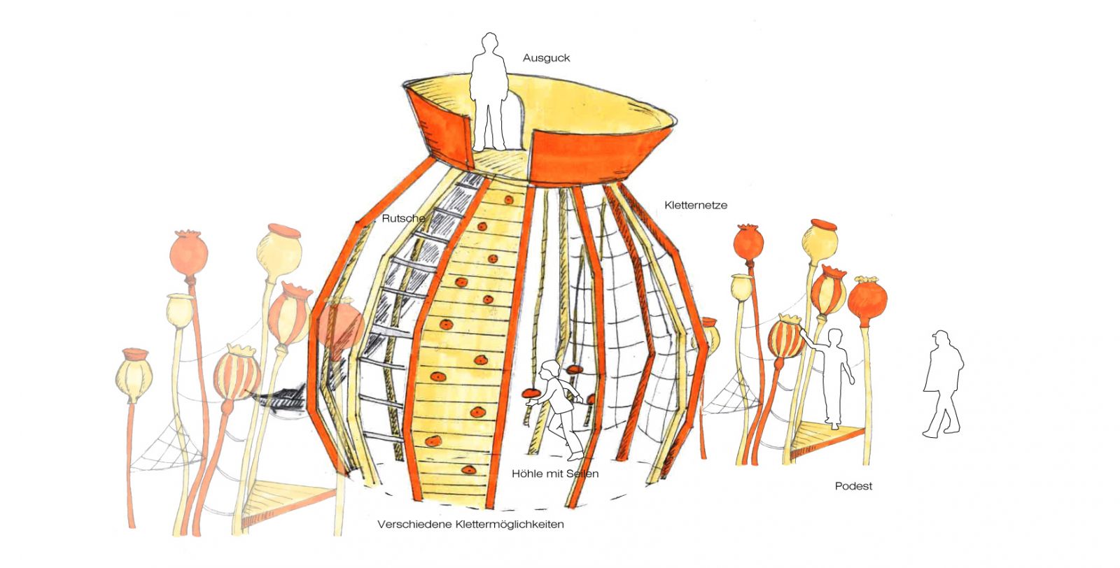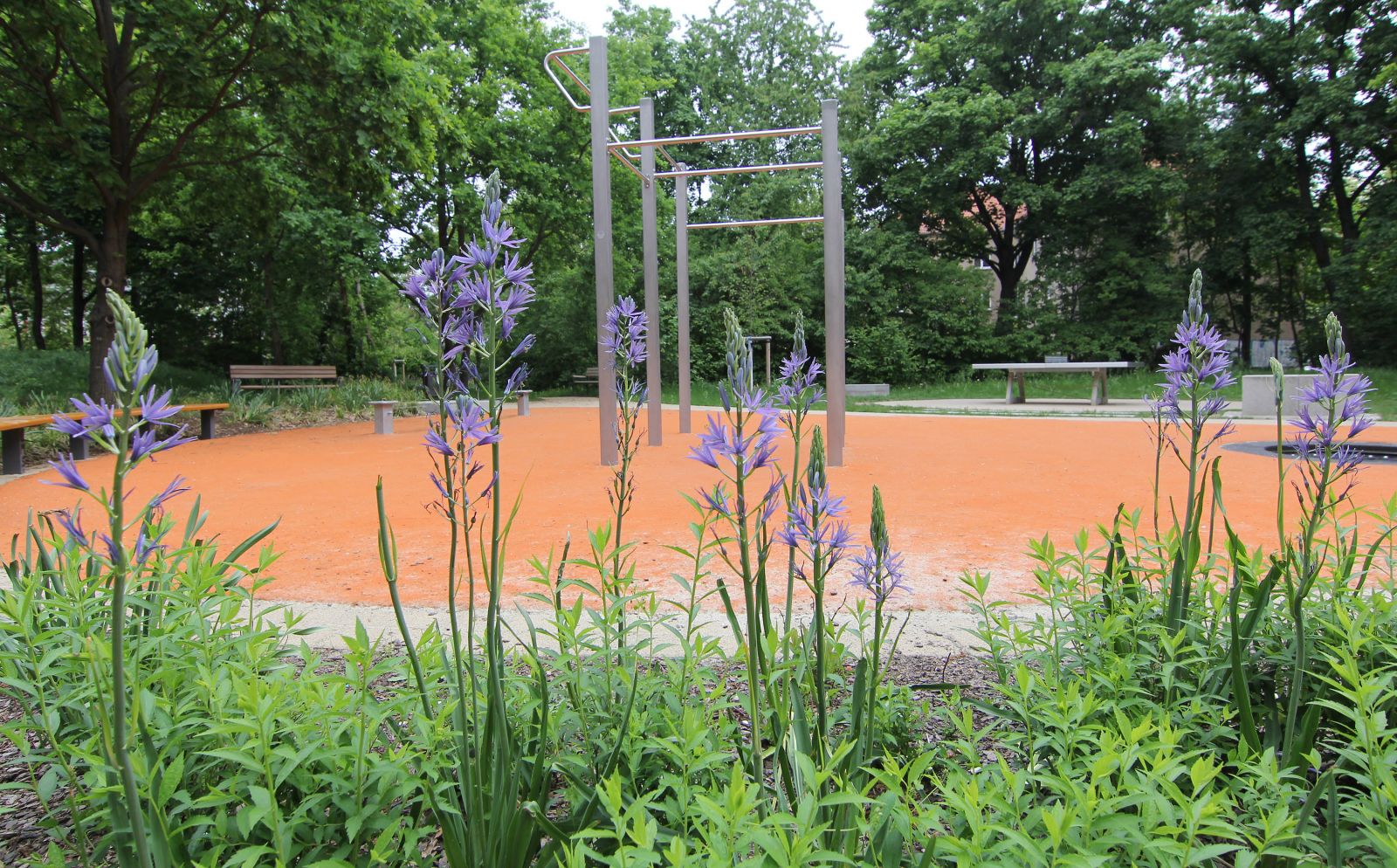 Der Spiel- und Sportbereich für ältere Kinder, Jugendliche und Erwachsene entstand am Zugang von der Spenerstraße aus. Beide Spielflächen werden durch fächerartige Bodenmodellierungen eingefasst, welche bepflanzt und in das Spielgeschehen integriert wurden.