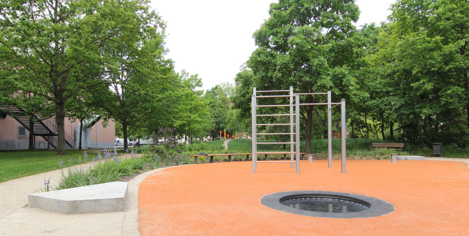 In die entstehende Parkanlage an der Haydnstraße wurden zwei Spiel- bzw. Sportbereiche integriert. Die Bereiche unterteilen sich nach Alters- und Nutzergruppen in eine Spielplatzfläche für Kleinkinder und größere Kinder mit Wasserspiel und Matschanlage sowie großem Klettergerät und eine eher sportlich ausgerichtete Spielfläche für ältere Kinder und Erwachsene mit den Schwerpunkten Calisthenics-Anlage, Tischtennis, Trampolin und Slackline.