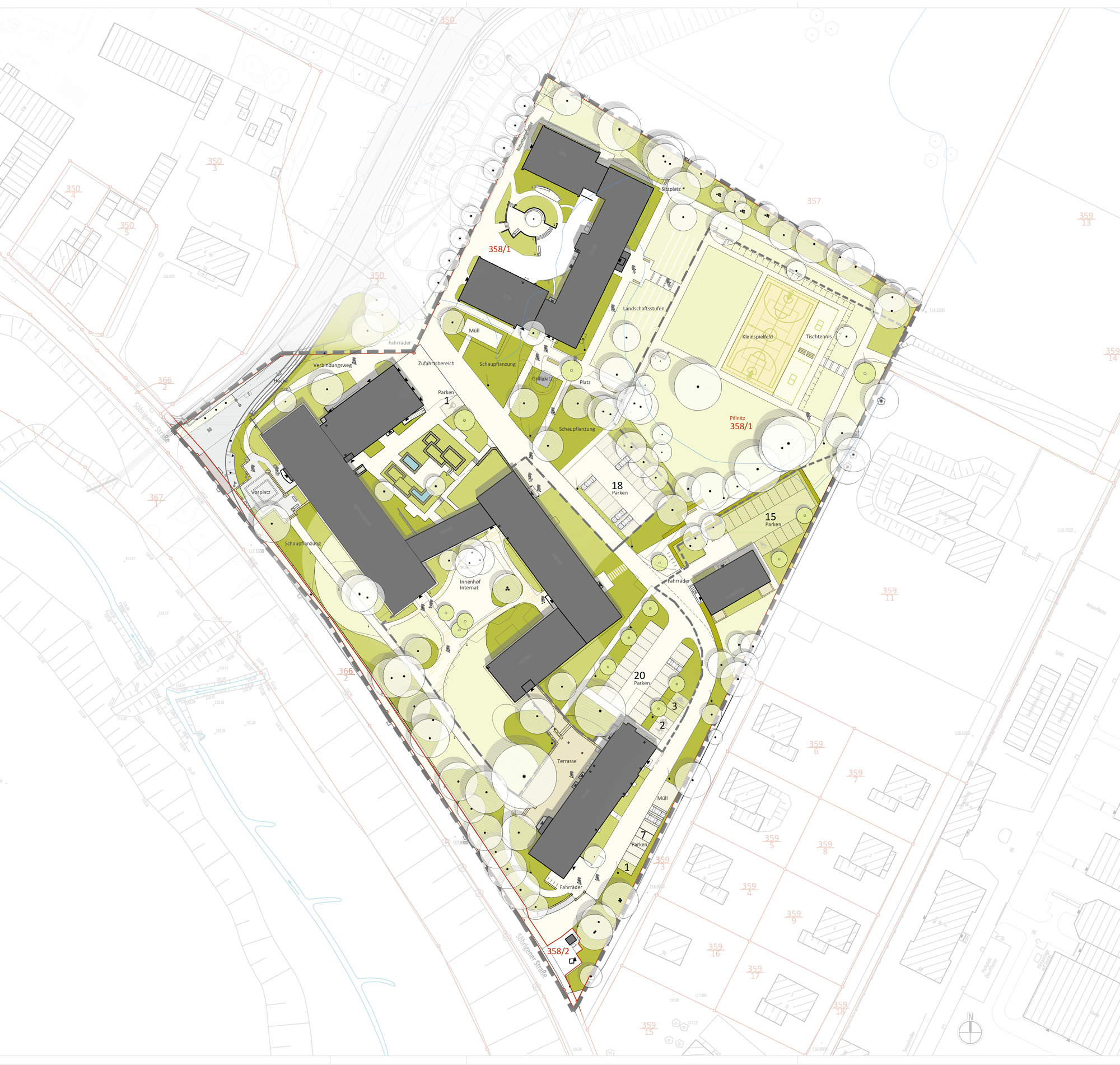 Anschließend erfolgte die Objektplanung der Freianlagen im Zuge der Sanierungsplanung der Gebäudeteile. Der Entwurf sollte verschiedene Nutzungsfunktionen berücksichtigen. So bildeten neben der Erstellung mehrerer Varianten zur Parkplatzeinordnung, die Integration eines Kleinspielfeldes, von Tischtennisplatten und Sitzmöglichkeiten die Gestaltung des Internat-Innenhofs, die barrierefreie Anbindung des Gebäudes und der Sportflächen sowie die Anordnung künftiger Pflanzenschauflächen Entwurfsschwerpunkte.